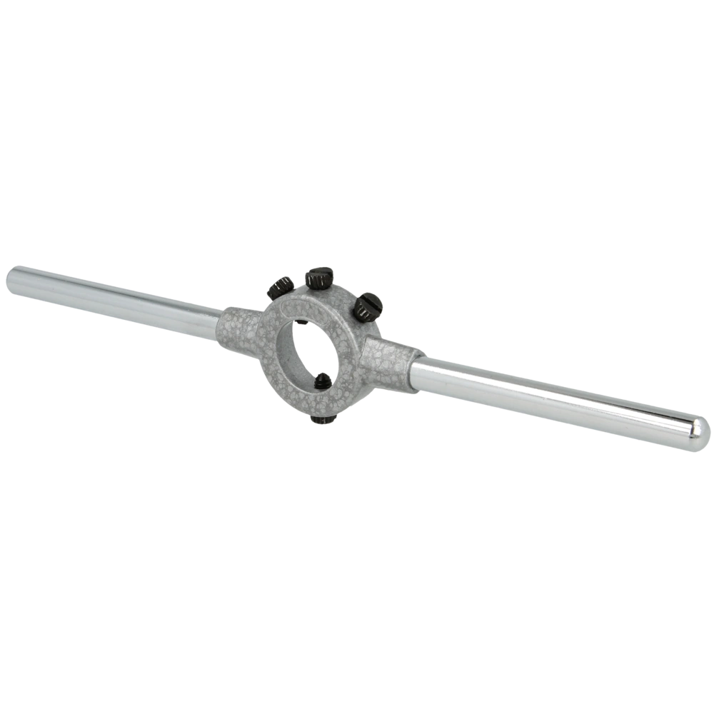 Die stock in accordance with DIN 225 with steel handle that can be unscrewed for closed and slotted taps in accordance with DIN EN 24231.