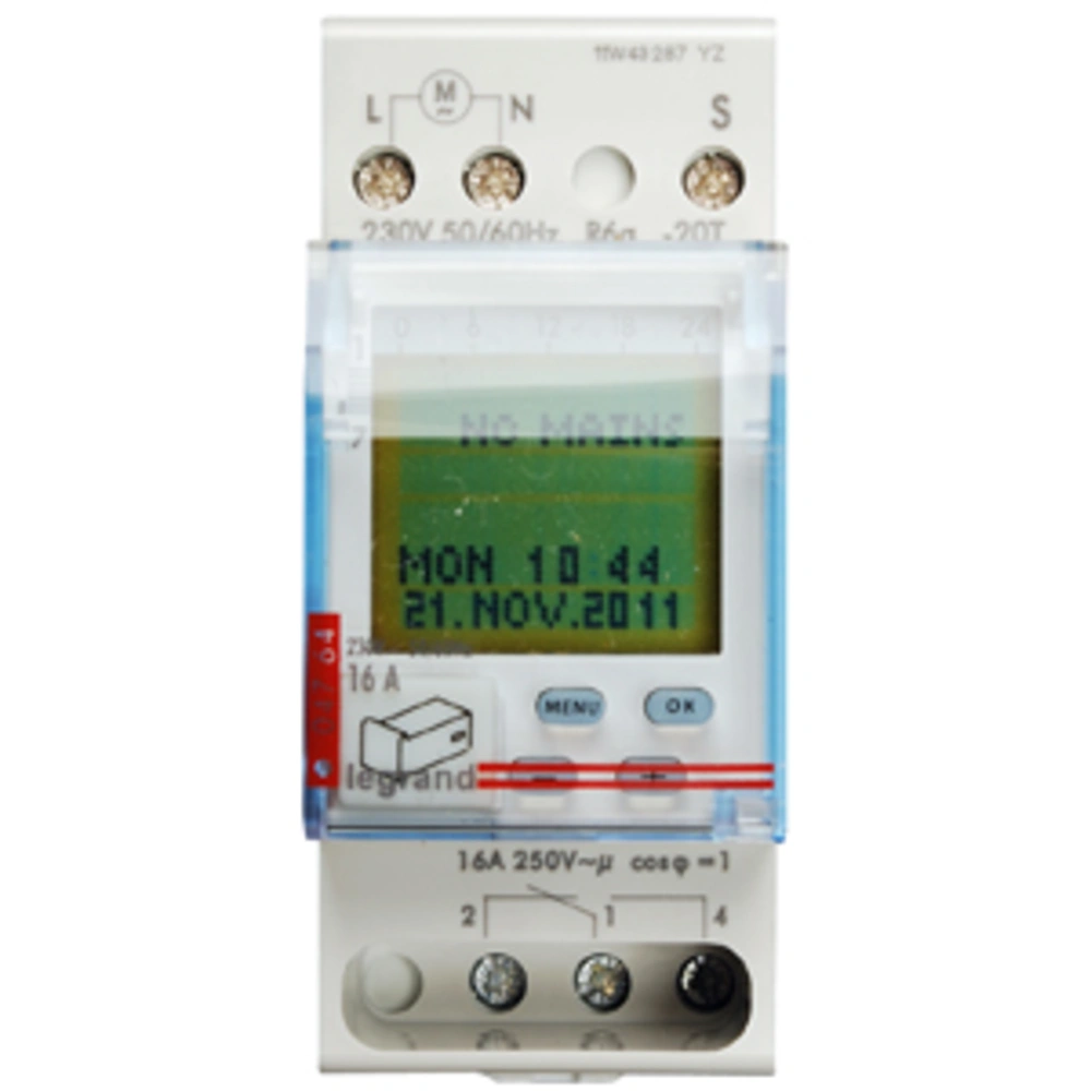 Digital time switch for weekly programming for mounting on a DIN rail.
