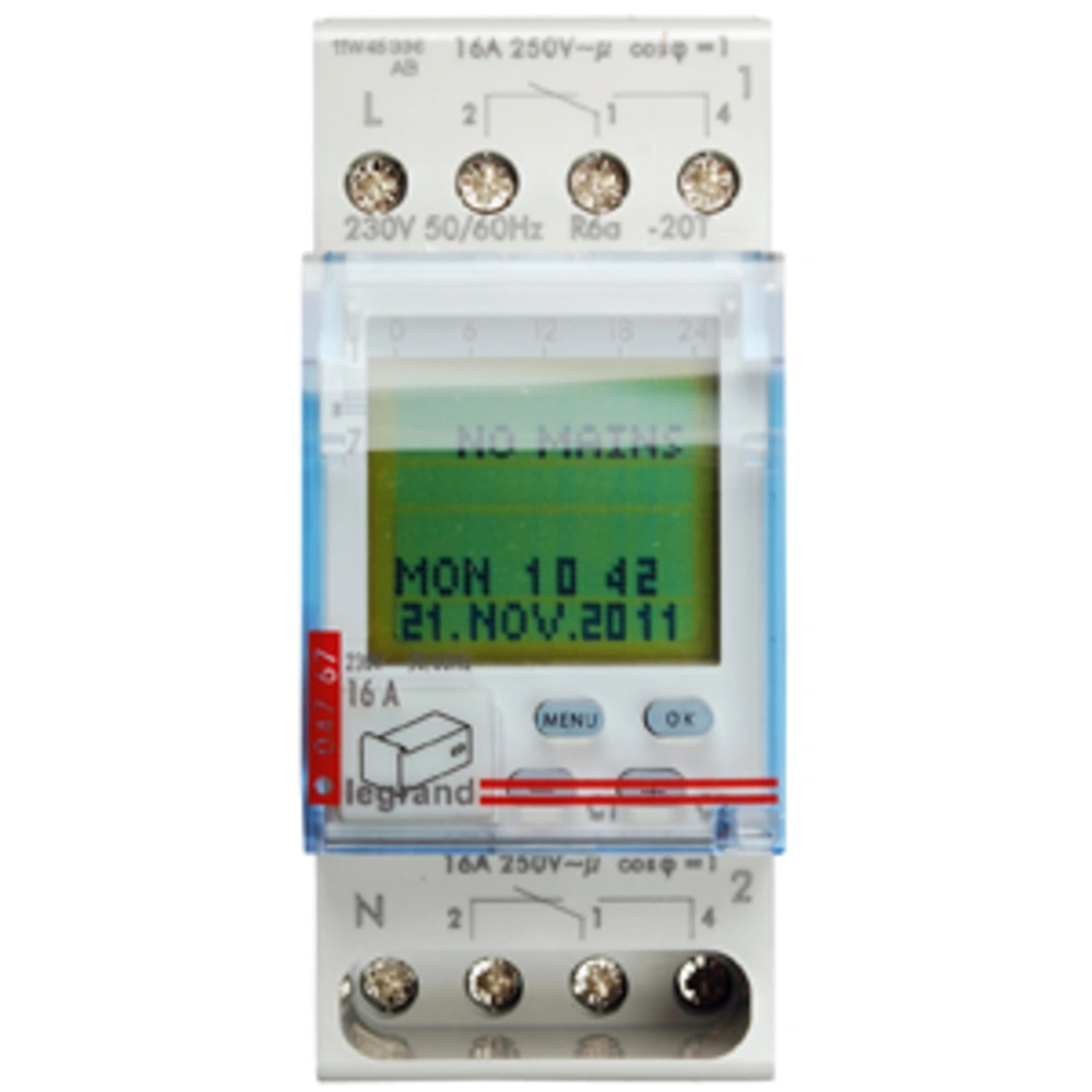 Digital time switch for weekly programming for mounting on a DIN rail.