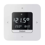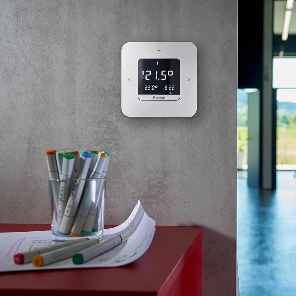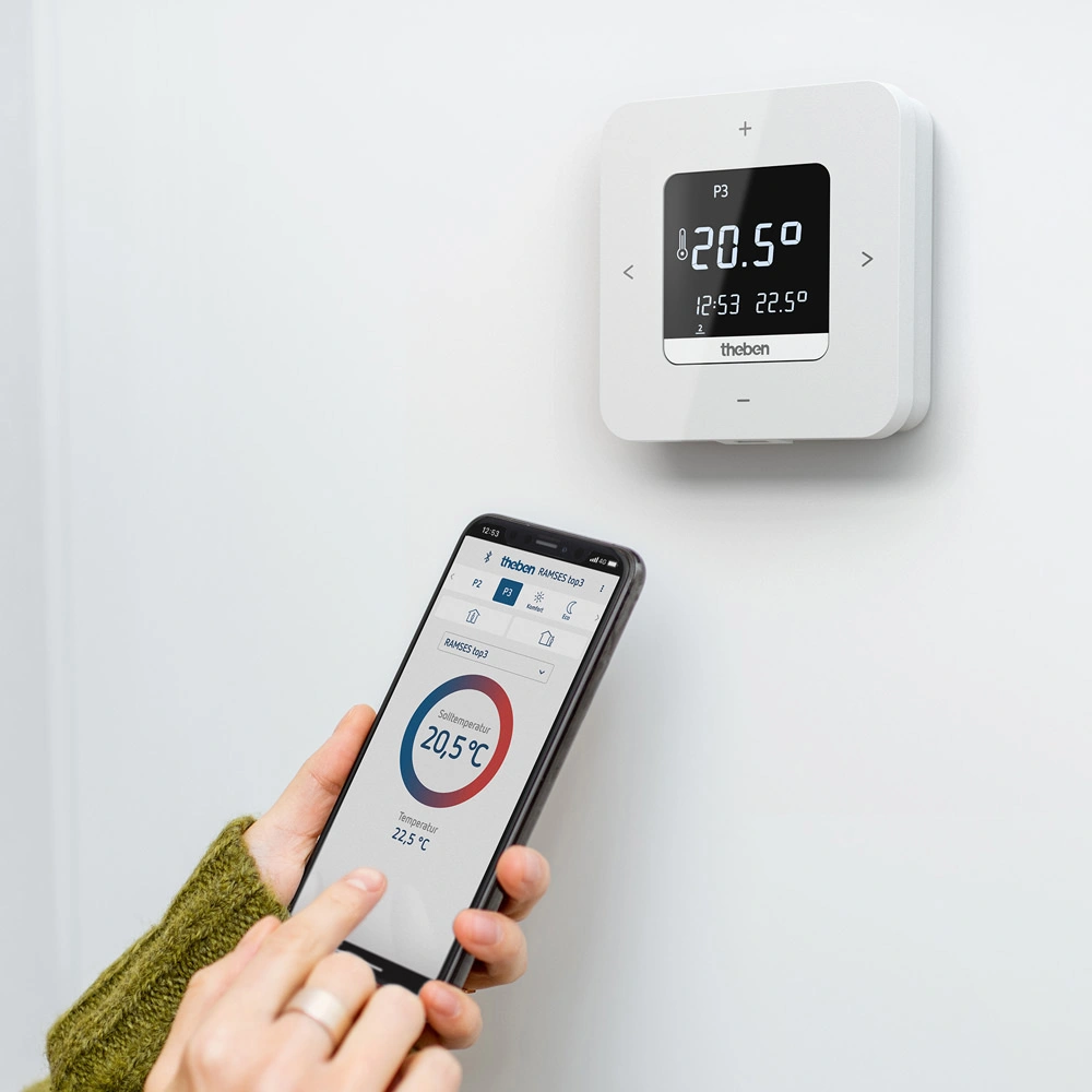 Digital clock thermostat with large illuminated display. Suitable for energy-efficient room temperature control in single-family homes, apartments and offices - conveniently operated via smartphone app. An external input is available for connecting a presence detector, remote sensor, floor sensor, window contact or telephone switch. Clear text lines guide the user step by step through programming. Three individually adjustable basic programmes are available, with the option to select up to three different temperature levels as needed.