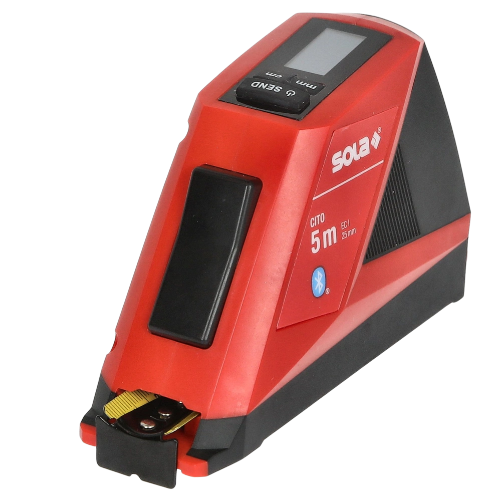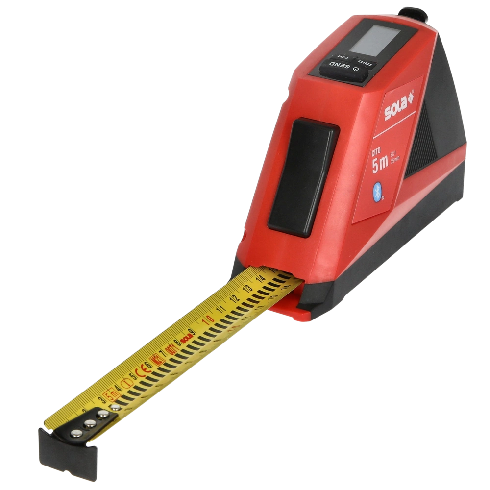 Digital tape measure for comfortable measurement indoors and outdoors. The tape mesure with sturdy housing can be easily operated by pushbutton. Measurements are taken in mm or cm. The digital display can be read well even if visibility is poor. The Bluetooth app allows for the measured values to be transmitted to the SOLA Measures app. The tape measure is also provided with a stop function, a return lock and an automatic switch-off function. The device is stored in the practical belt case with robust clip and additional side pocket.