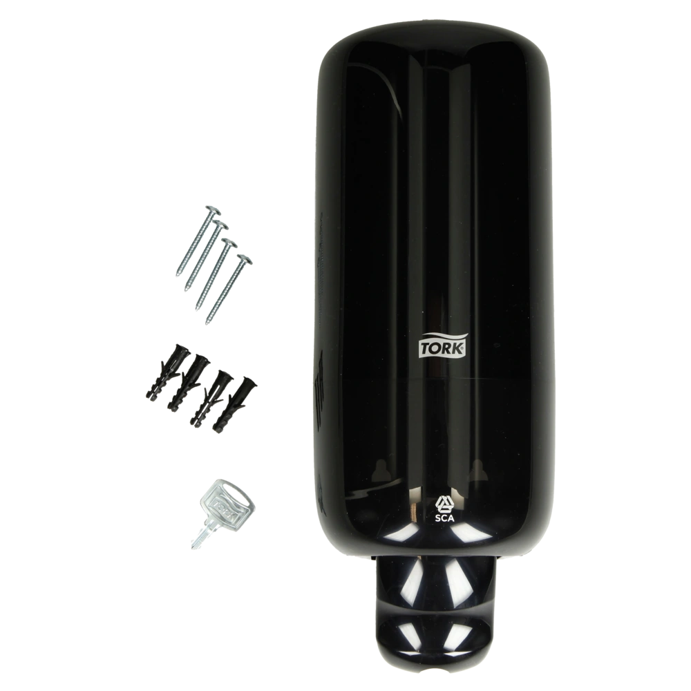 Dispenser made of impact-resistant plastic for liquid and spray soap in sealed 1,000 ml bottles. The soap dispenser features a viewing window, is lockable, very user-friendly and operates drip-free. Installation can be done using the included mounting materials or, without drilling, with the attached adhesive strips.