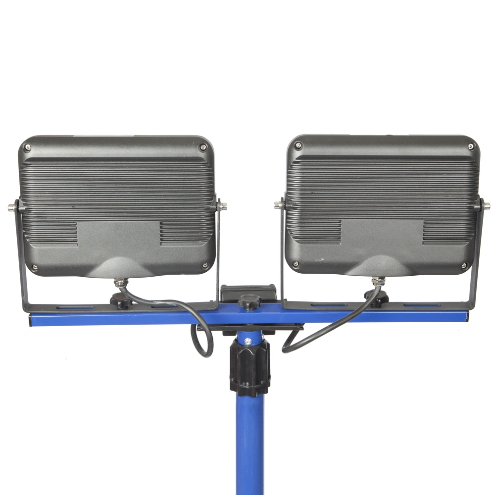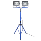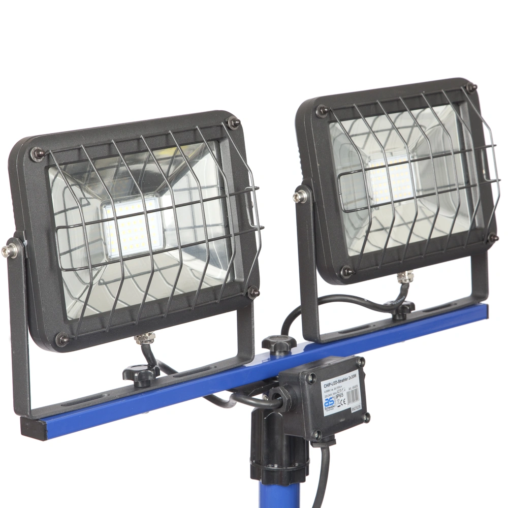 Heavy-duty floodlight with 2 LED spotlights on a tripod. The lights can be positioned separately from each other and are protected against splash water and dust. The safety glass is additionally protected by a safety guard. The tripod can be set up quickly and easily. It ensures a safe stand. The Samsung LED elements used provide for a long life, hardly any heat development and consistently high light output.