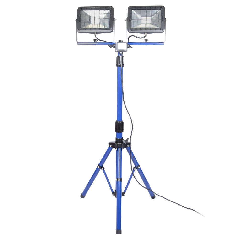 Heavy-duty floodlight with 2 LED spotlights on a tripod. The lights can be positioned separately from each other and are protected against splash water and dust. The safety glass is additionally protected by a safety guard...