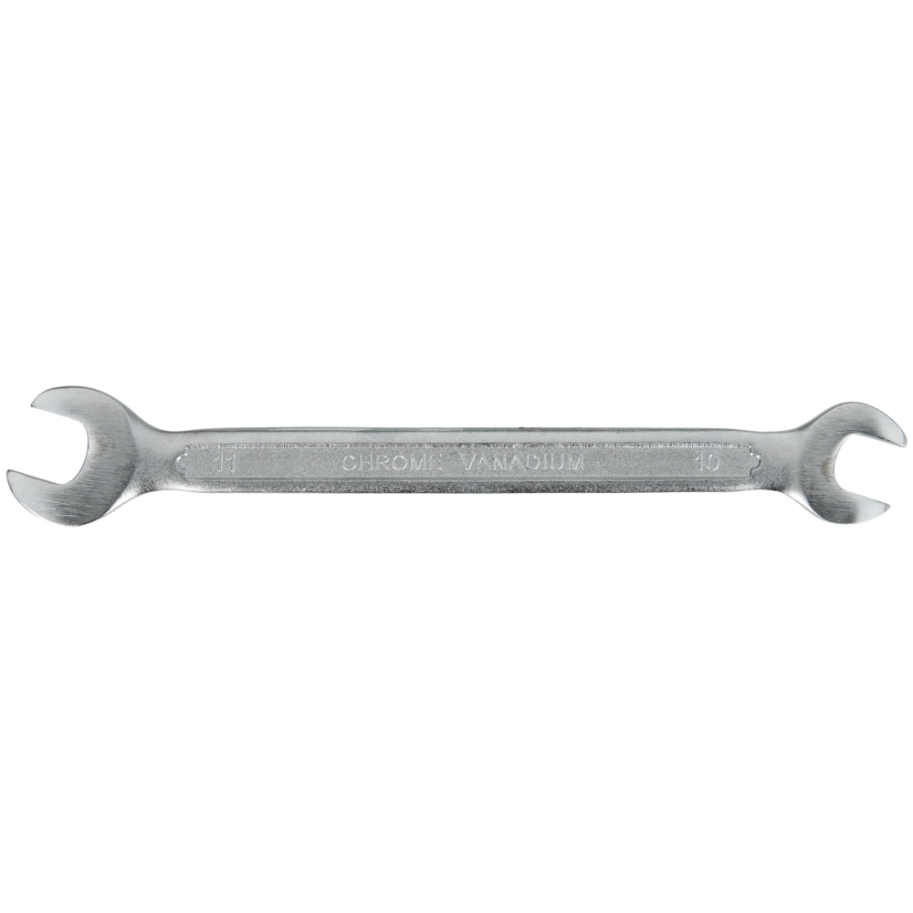 The double open-ended spanner is made of chrome-plated and matt satin-finished chrome vanadium steel. Its jaw heads are offset by 15°.