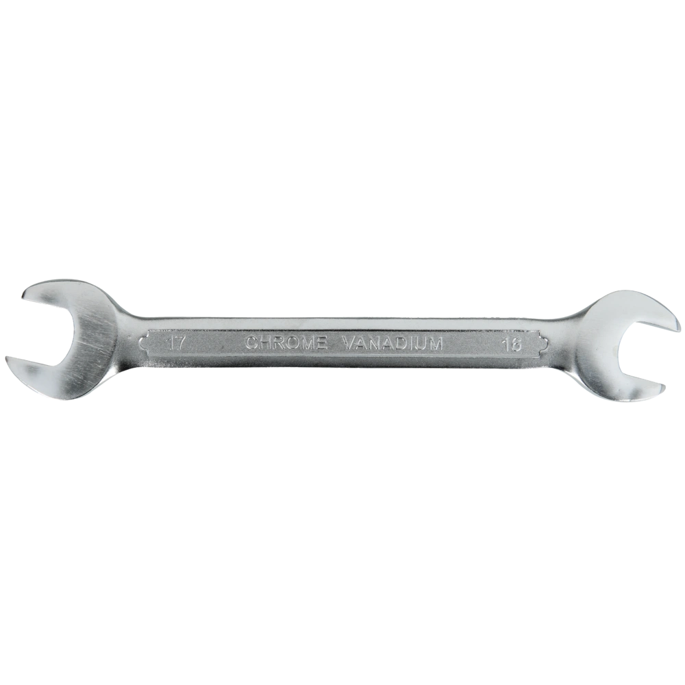 The double open-ended spanner is made of chrome-plated and matt satin-finished chrome vanadium steel. Its jaw heads are offset by 15°.