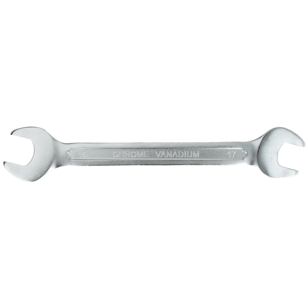 The double open-ended spanner is made of chrome-plated and matt satin-finished chrome vanadium steel. Its jaw heads are offset by 15°.