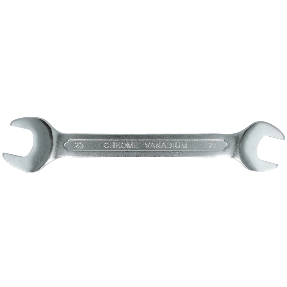 The double open-ended spanner is made of chrome-plated and matt satin-finished chrome vanadium steel. Its jaw heads are offset by 15°.