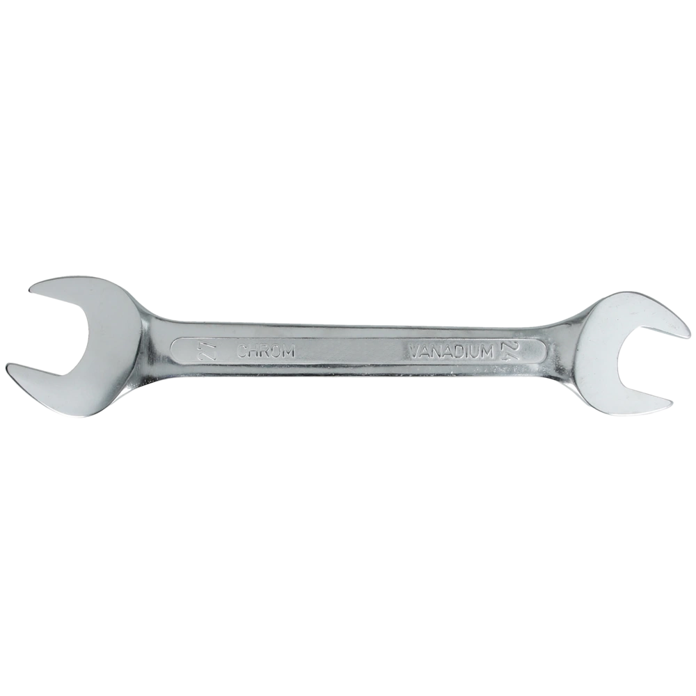 The double open-ended spanner is made of chrome-plated and matt satin-finished chrome vanadium steel. Its jaw heads are offset by 15°.