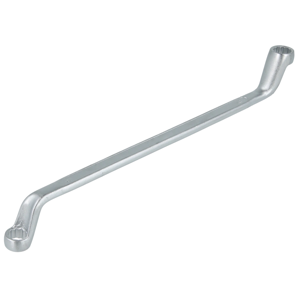 The double ring spanner is made of chrome-plated and matt satin-finished chrome vanadium steel. Both offset ring heads are thin-walled and polished.