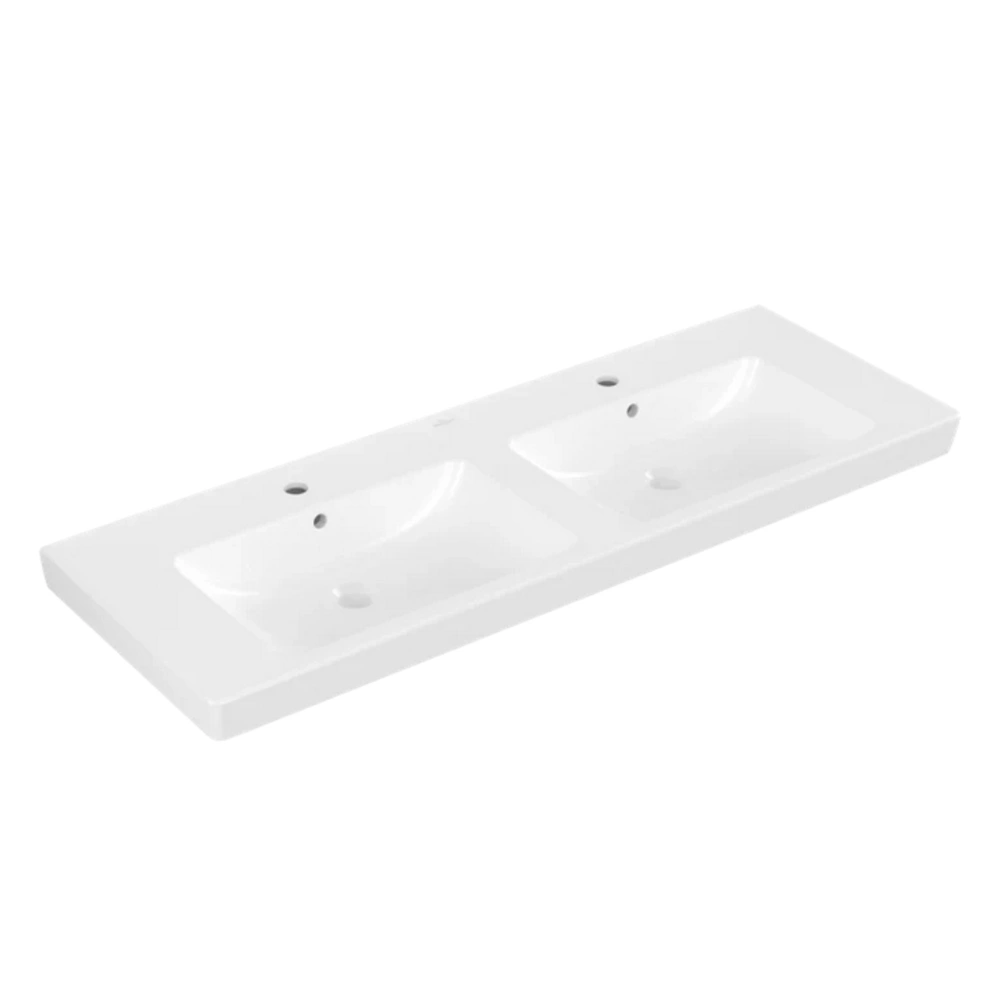High-quality double vanity washbasin in modern design for wall mounting. It is equipped with overflows and punched-out tap holes. The washbasin can be combined with matching vanity units and 3-hole tap fittings.