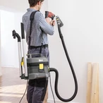 Extremely lightweight vacuum cleaner with shoulder strap for comfortable transport and use on ladders and scaffolds. All tools and nozzles are stored at hand in the accessory compartment.