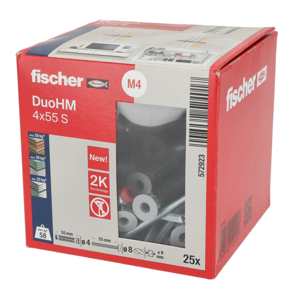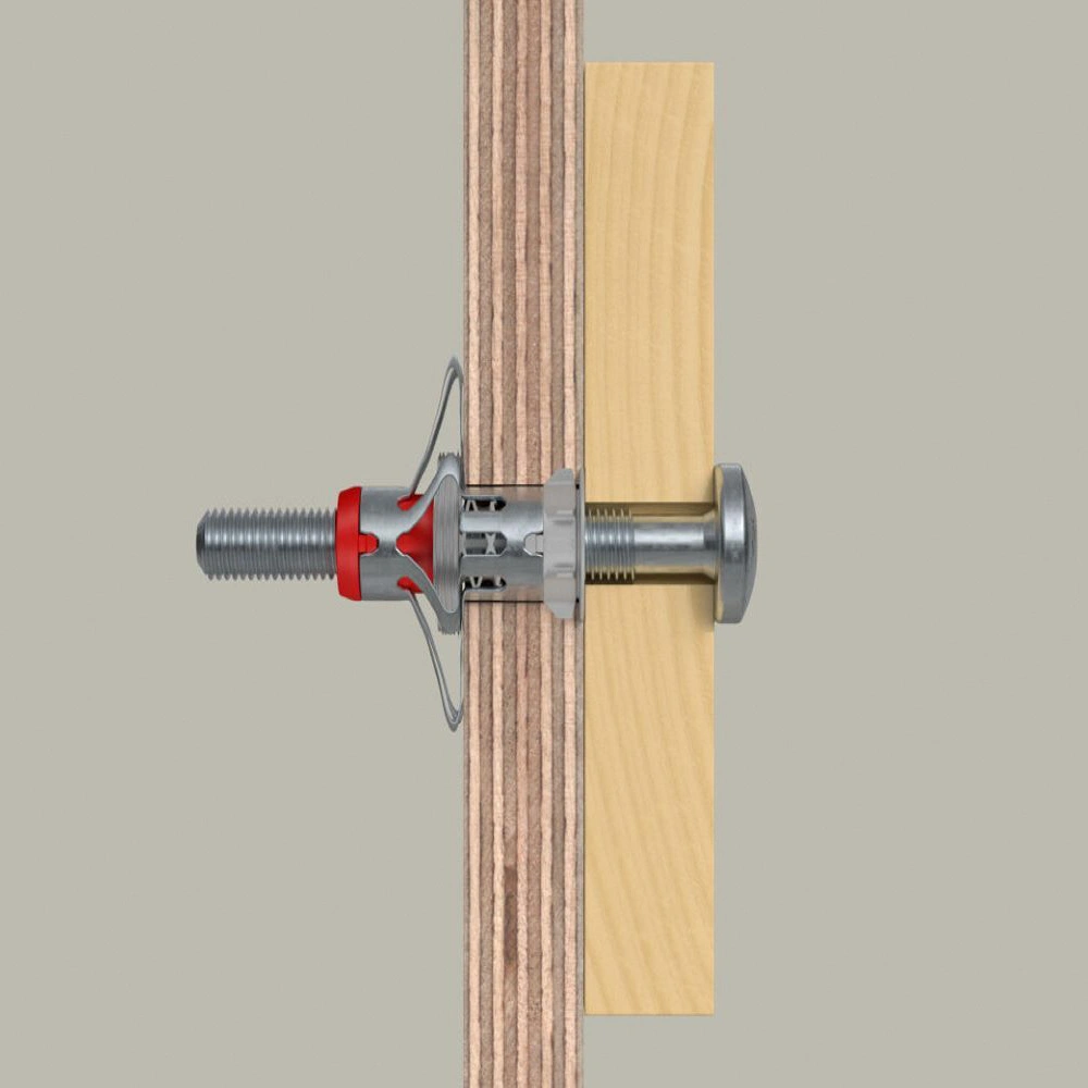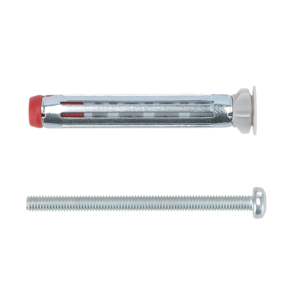 All product informationDuoHM cavity plug with metric screw for the use in panel building materials with different thicknesses. The combination of nylon and metal guarantees a high load-bearing capacity. The particularly easy setting of the plug is possible by using only a cordless screwdriver. When the screw is being inserted, the metal sleeve presses against the back of the panel, while the nylon part knots in the panel. This ensures a permanently strong hold. The nylon anti-rotation lock protects the building material from damages.