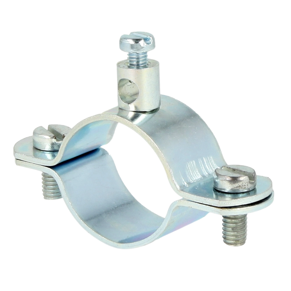 Earthing clamp made of galvanised, chromated steel to be used on galvanised pipes in dry interiors. Pipes with a cross section of up to 16 mm2 can be connected.