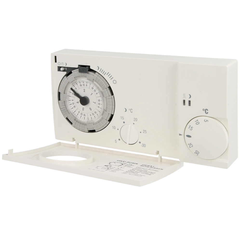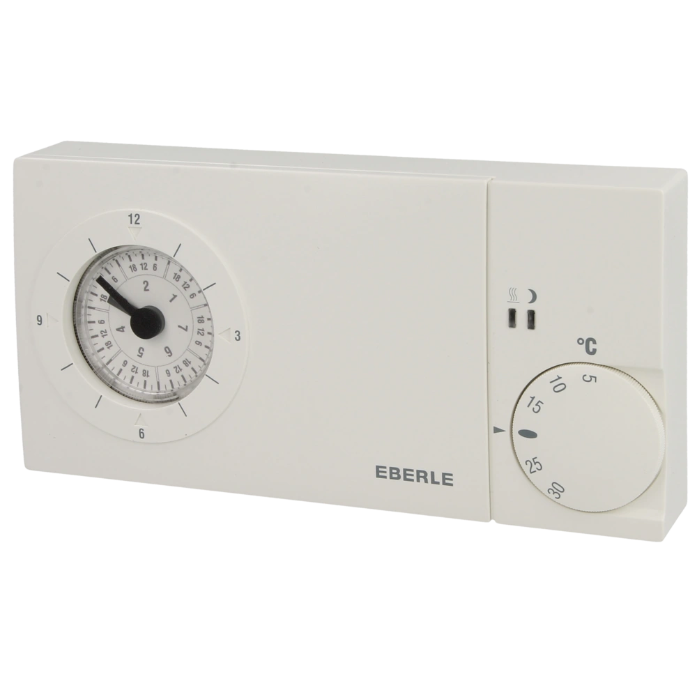 All product informationThis Eberle clock thermostat is characterised by its simple operation, separated adjustment of day and night temperature, settable cycle period and replaceable clock module for daily and weekly switching. Mounting is on the adapter frame, which is available separately.