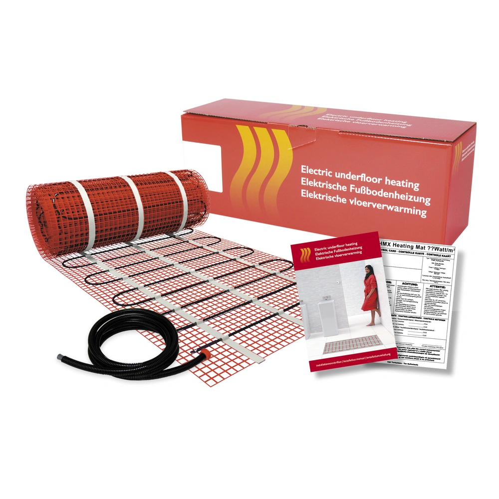 Ready-to-install complete set with electric surface heating, roll-out thin-layer mat and digital clock thermostat. Due to the extremely thin support webbing, the heating can be laid on the levelling compound and in tile cement.