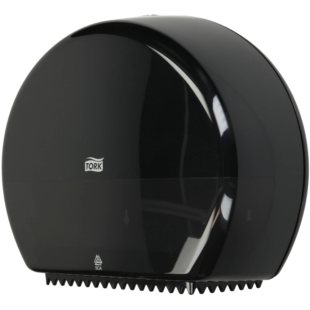 All product informationRobust WC paper dispenser T2 made of shock-resistant plastic for Tork Mini Jumbo toilet paper. The paper can be dispensed easily thanks to the fibreglass-reinforced tear-off teeth at the dispenser. Additionally, the paper brake and the practical rest-roll function ensure paper consumption is as low as possible. The lockable front panel with window for filling level inspection can be folded down for easy refilling.