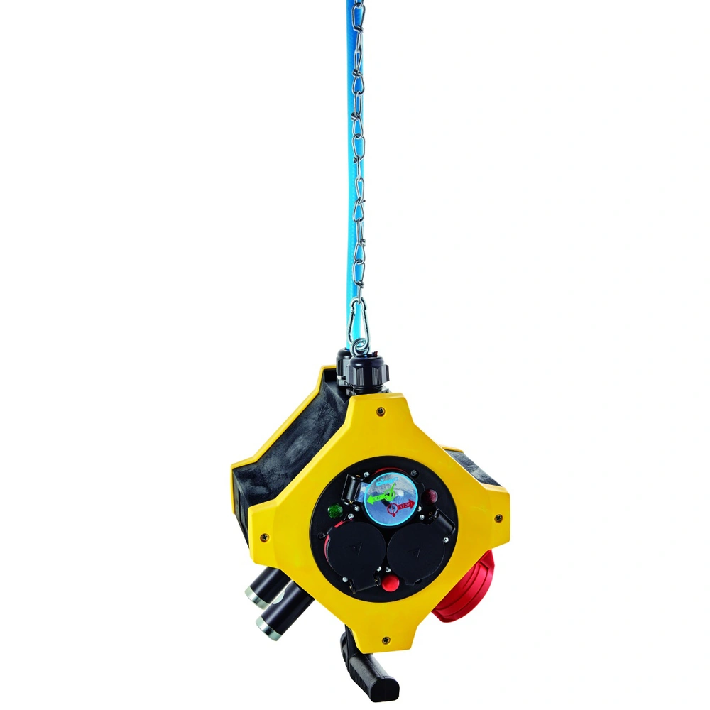 The galvanised suspension chain relieves the connection hose and connection cable (cable and chain 2 metres each). The integrated thermal fuse automatically switches off in the event of overheating. There are 3 shockproof sockets each on front and back side.