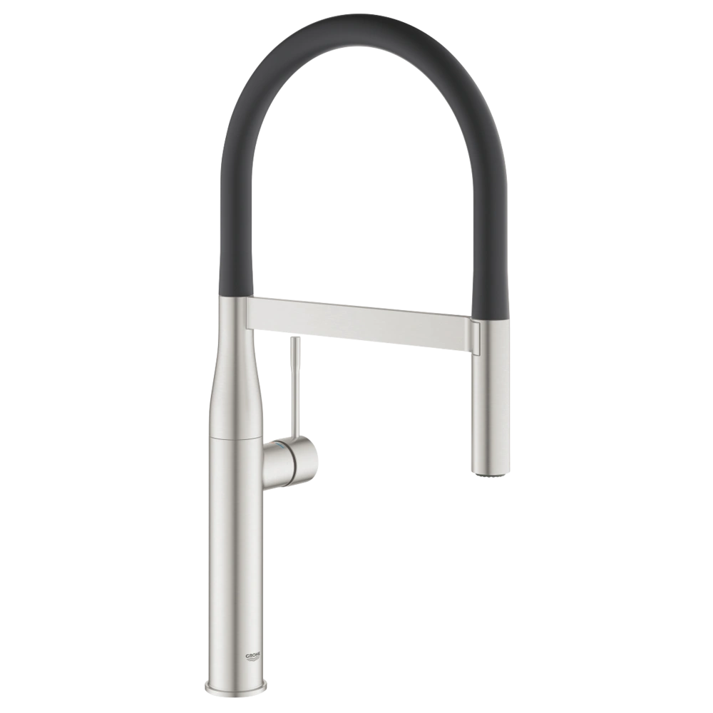 Design-oriented single-lever kitchen fitting for monobloc installation. The tap intrinsically safe against backflow has a GROHE 28 mm SilkMove® ceramic cartridge with temperature limiter and a spout swivelling by 360° with a professional metal spray. It can be diverted from laminar to spray jet and is provided with a flexible, hygienic GrohFlexx® Santoprene hose which is set off in colour. Due to the Grohe EasyDockM® system, the rinsing spray slides back to its initial position easily and smoothly.
