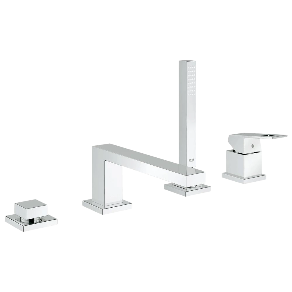 All product informationThe GROHE Eurocube 4-hole single-lever bath combination consists of hand shower Euphoria Cube, a 2,000-mm long metal shower hose, the metal operating lever, flexible connection hoses and a bath spout with mousseur. The fitting is equipped with a GROHE SilkMove® 46 mm ceramic cartridge, GROHE StarLight® chrome finish, a bath/shower diverter and a pre-installed spout connection.