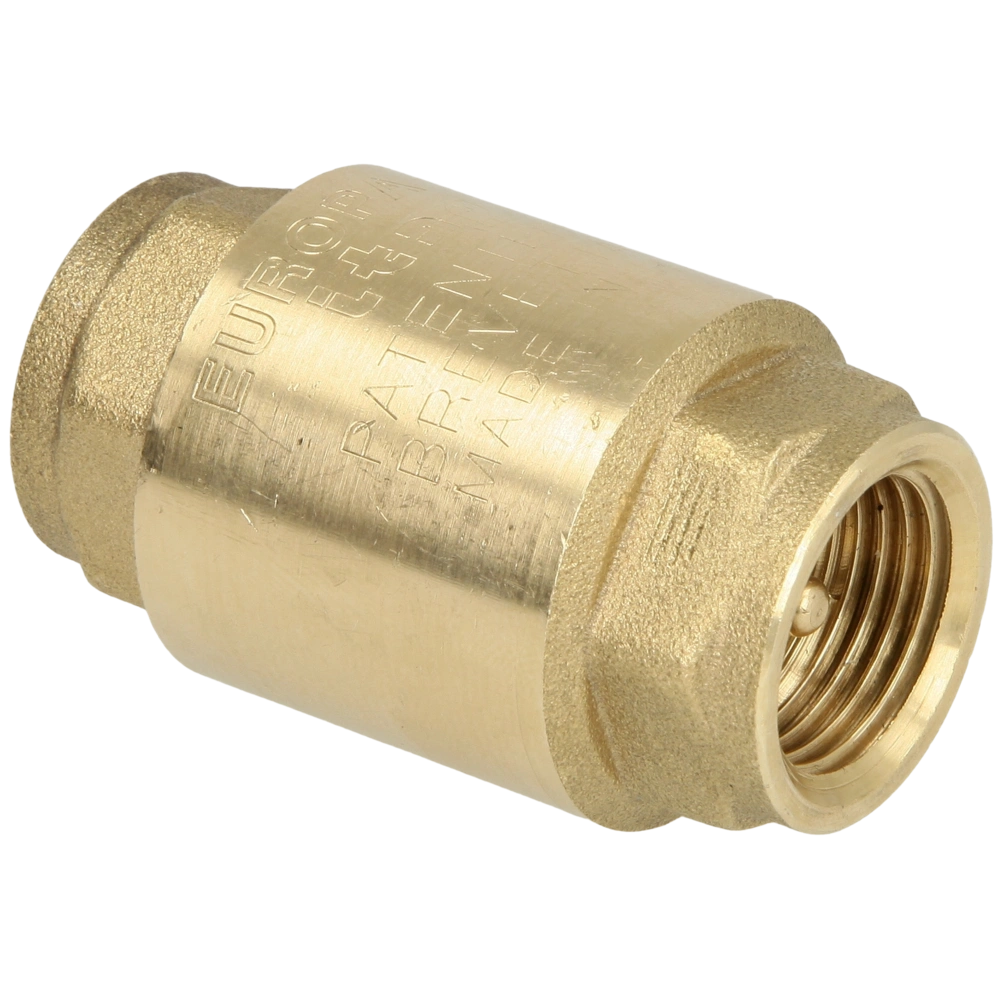 Check valve suitable for water supply, heating, air-conditioning or compressed-air systems. The valve can be installed horizontally, vertically or obliquely. Its body is made of brass with a valve insert and spring made of stainless steel and an NBR washer.