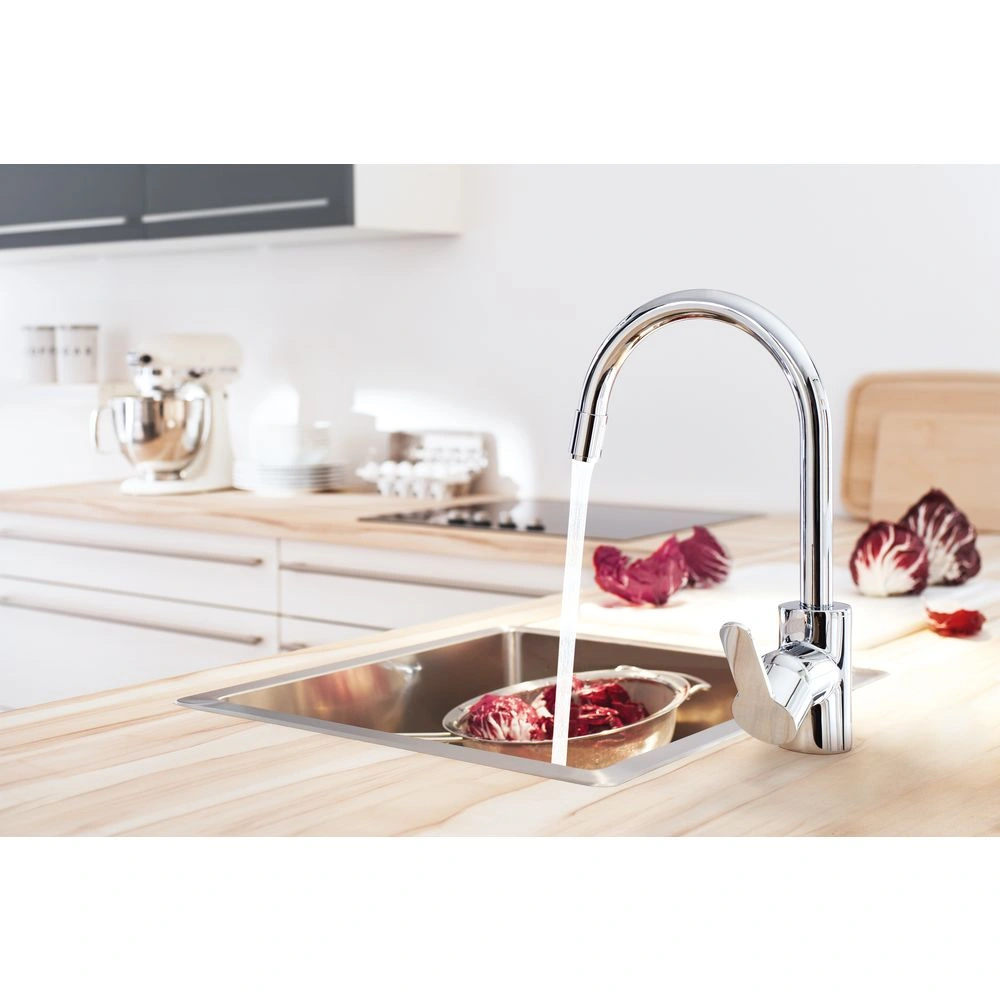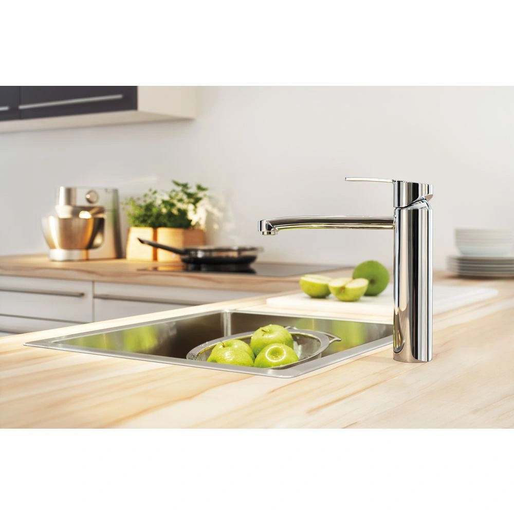 The high-pressure tap has a GROHE 28 mm SilkMove® ceramic cartridge and a spout with flow straightener. The GROHE StarLight® chrome finish is easy to clean, hygienic and scratch-resistant.