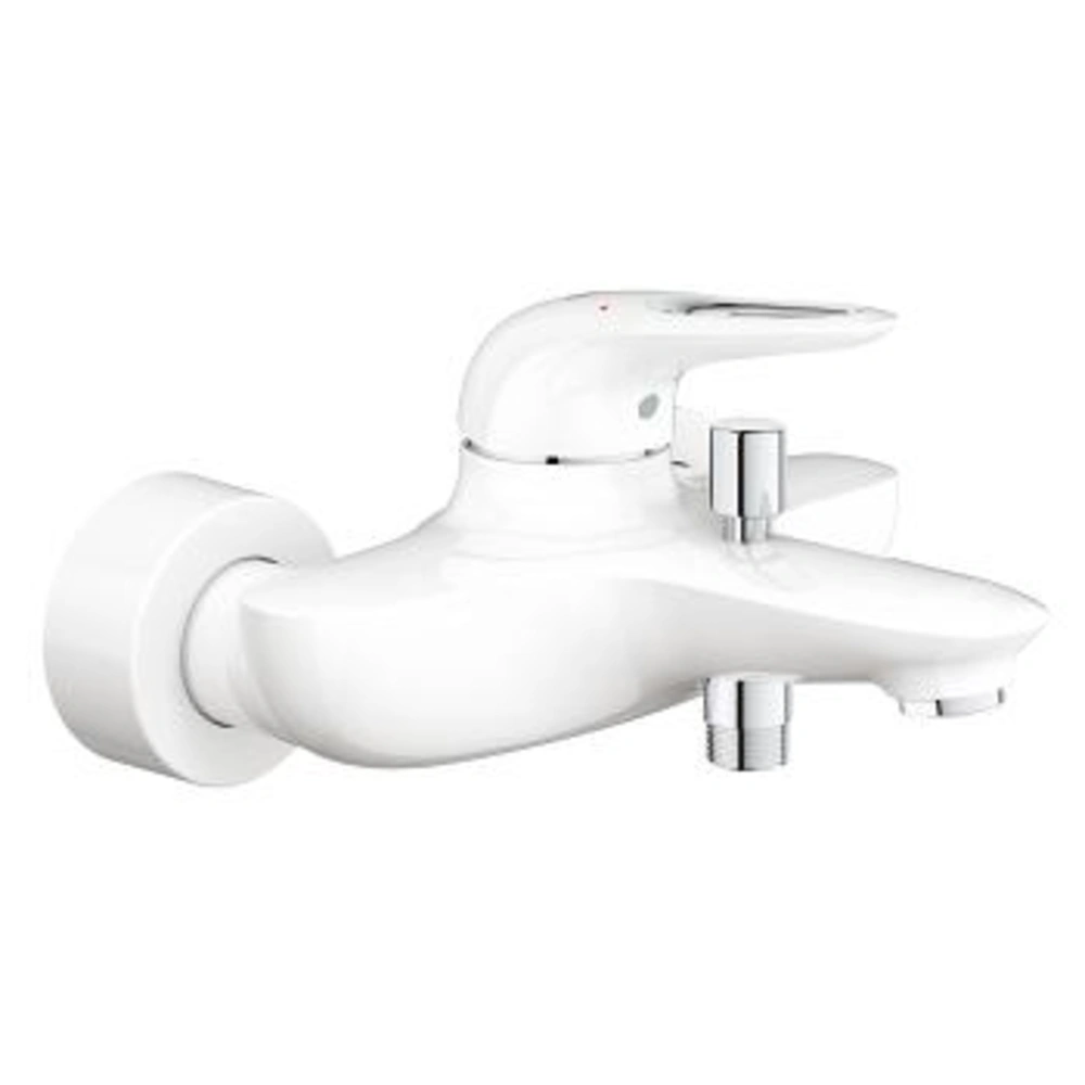 The tap fitting is equipped with a 35 mm ceramic cartridge, a temperature limiter and a variably adjustable flow rate limiter. The spout is fitted with a mousseur. Diversion from bath spout to shower is by pulling out the button, which automatically resets into its original position as soon as the water has been turned off. An integrated non-return valve is in the shower outlet to protect against backflow. The surface is easy to clean and scratch-resistant.