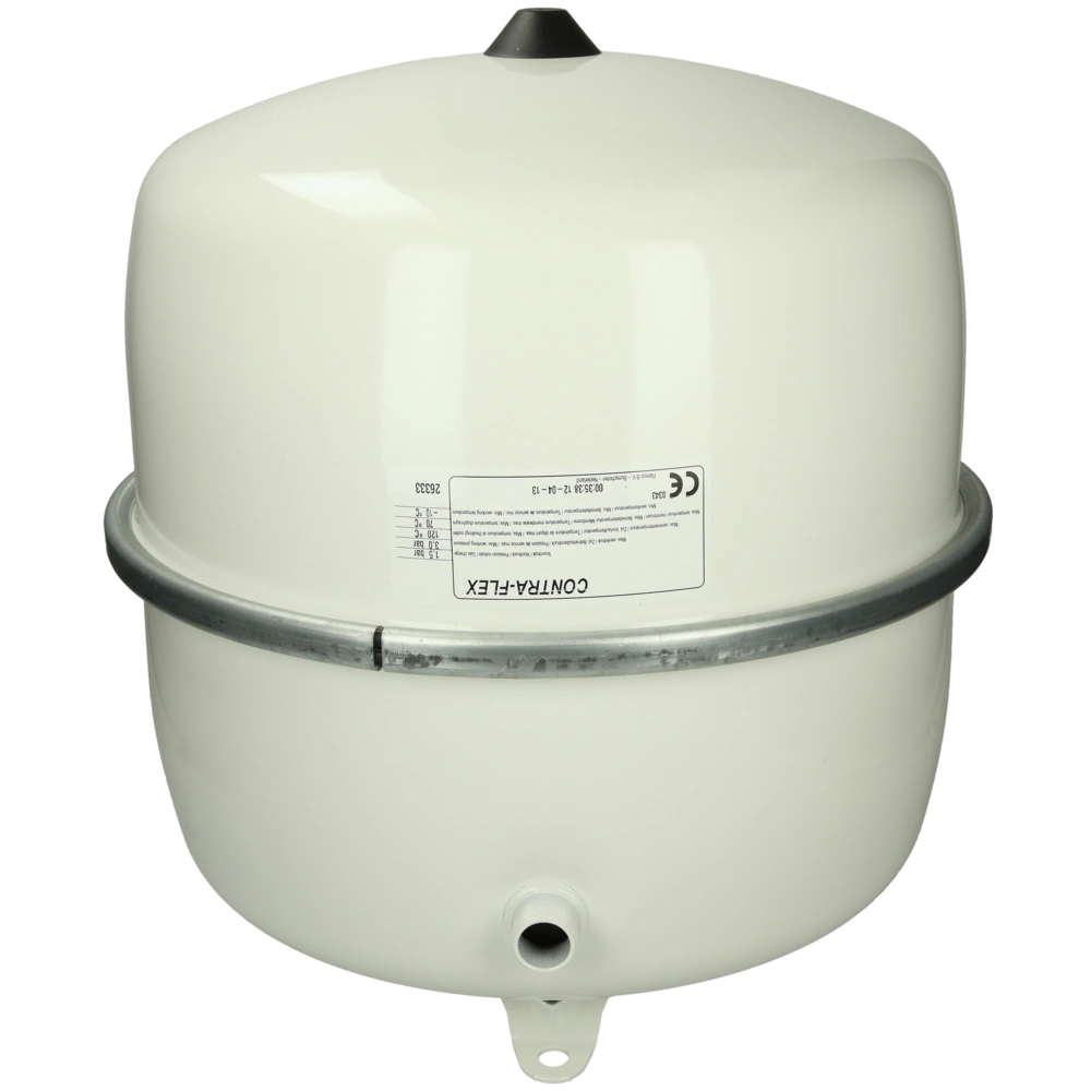 High-quality diaphragm expansion vessel suitable for closed heating and cooling installations. The flexible diaphragm compensates the thermal expansion of the water. Thereby, the pressure of the system remains constant. The vessel is filled with nitrogen gas to protect it against corrosion and pressure losses. Each vessel is factory-tested for tightness and pre-pressure. The diaphragm made of SBR rubber is approved for a glycol content of up to 50% in the water. The powder-coated steel half shells are connected by a galvanised clamp ring. The vessel is equipped with 3 stable, welded-on support feet.