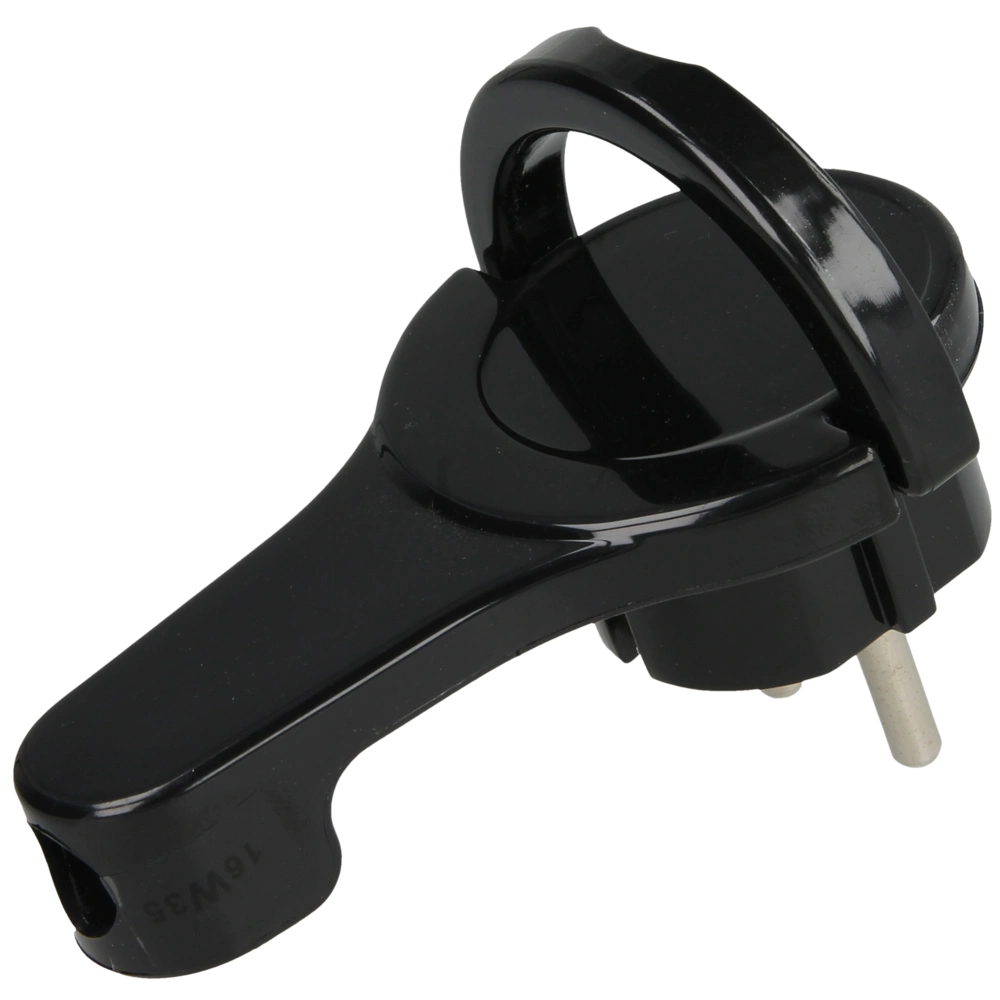 This is an extra-flat angle plug that fits behind any piece of furniture. It is only 8 mm thick. The lateral cable entry for cables of up to 3 x 1.5 mm² prevents cable bending. If the plug should be pulled out, a foldable grip facilitates the removal of the plug.