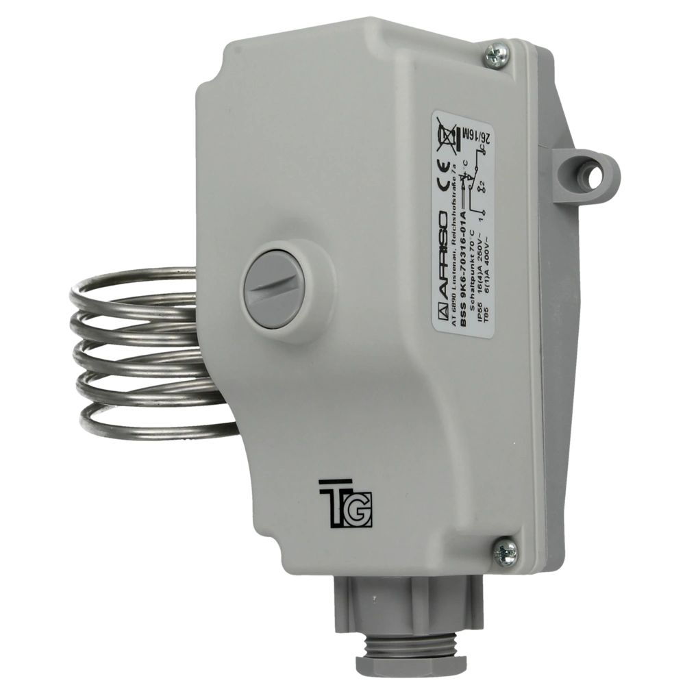 The safety temperature limiter with air sensor serves as fire protection switch at oil heatings. It is mounted in the area of the heat source. In case of fire, the control circuit is interrupted. Resetting is manual.