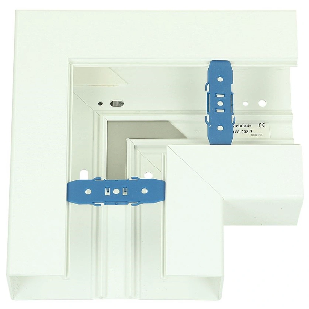 Single-compartment, symmetrical 90° flat angle for device installation trunking, made of rigid PVC, with two continuous mounting profiles and continuous perforation in the rear section. The supplied...