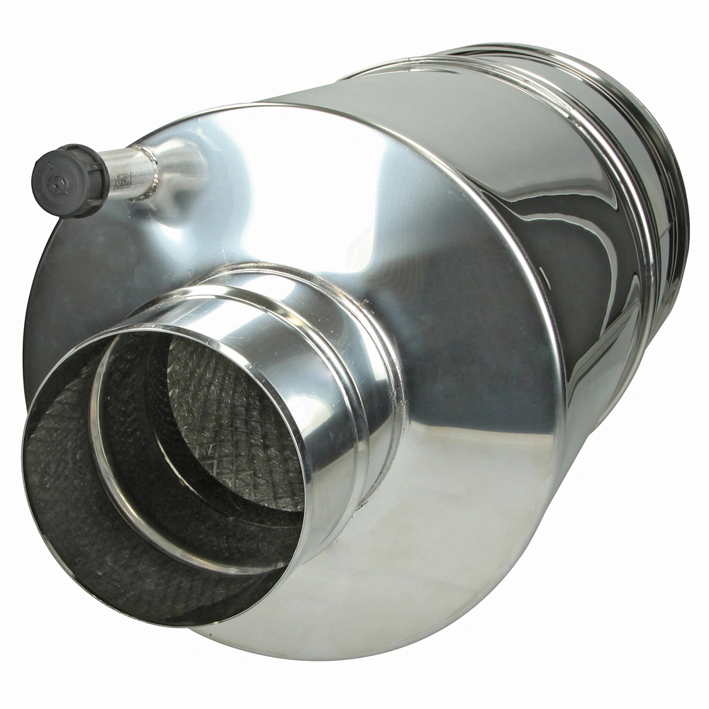 The durable standard silencer consists of a stainless steel housing with a water-repellent mineral fibre absorption core, protected by stainless steel fleece and an expanded stainless steel sheath. Thanks to the special mineral fibres, the silencer provides very good attenuation at medium and high frequencies.
