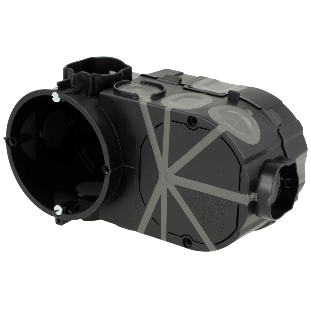 The electronics socket box is suitable for device inserts and electronic components such as EIB modules, relays or low-volt transformers. It is provided with 4 screw domes and a separator wall for safe separation of electrical circuits. This multi-talent is airtight thanks to its 2-component insertion.