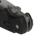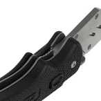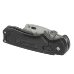 Professional cutter knife with folding function. It becomes a pocket knife with exchangeable trapezoidal blades. Double locking prevents accidental closing. A clearance-free blade holder made of stainless steel provides for precise cuts...
