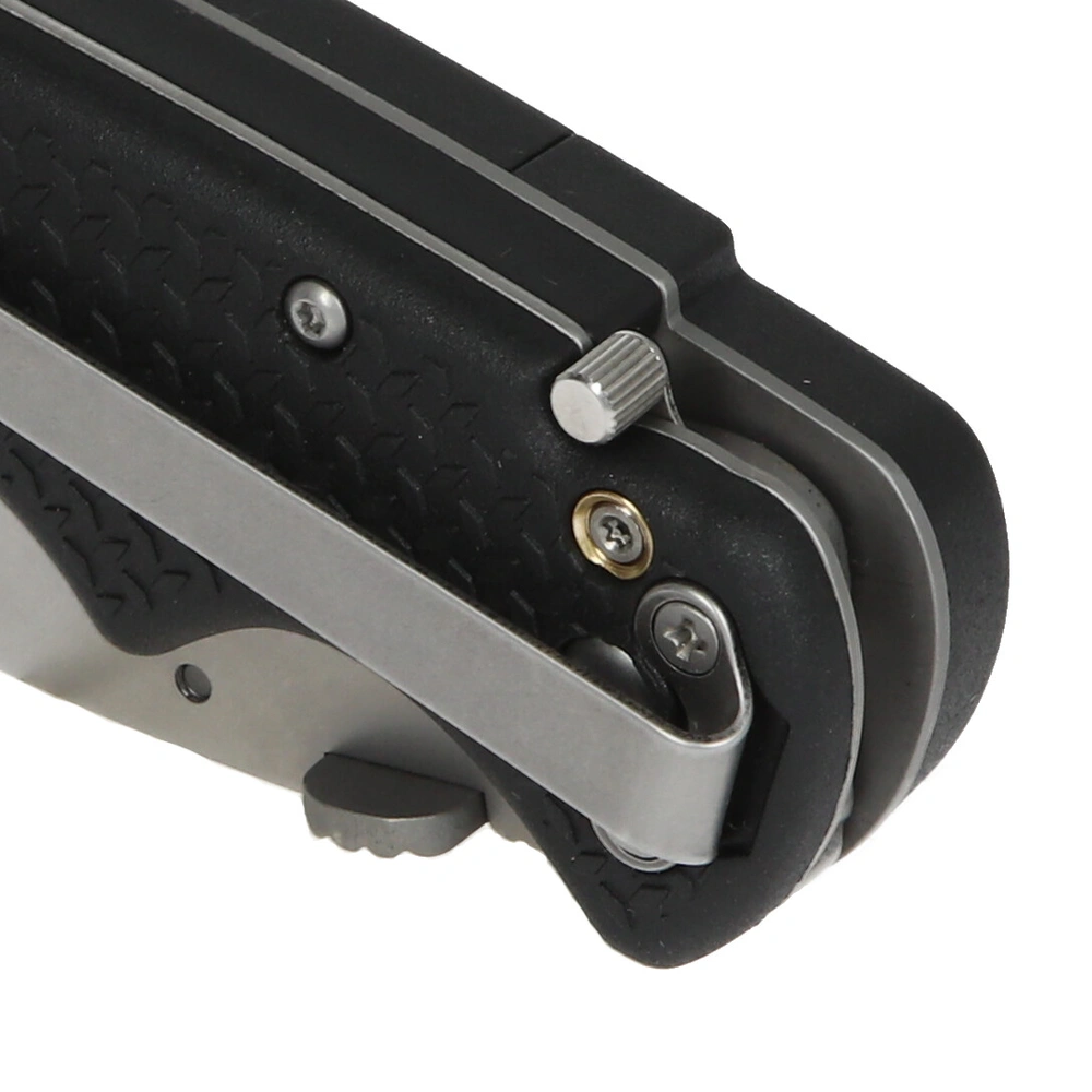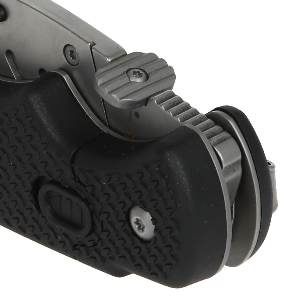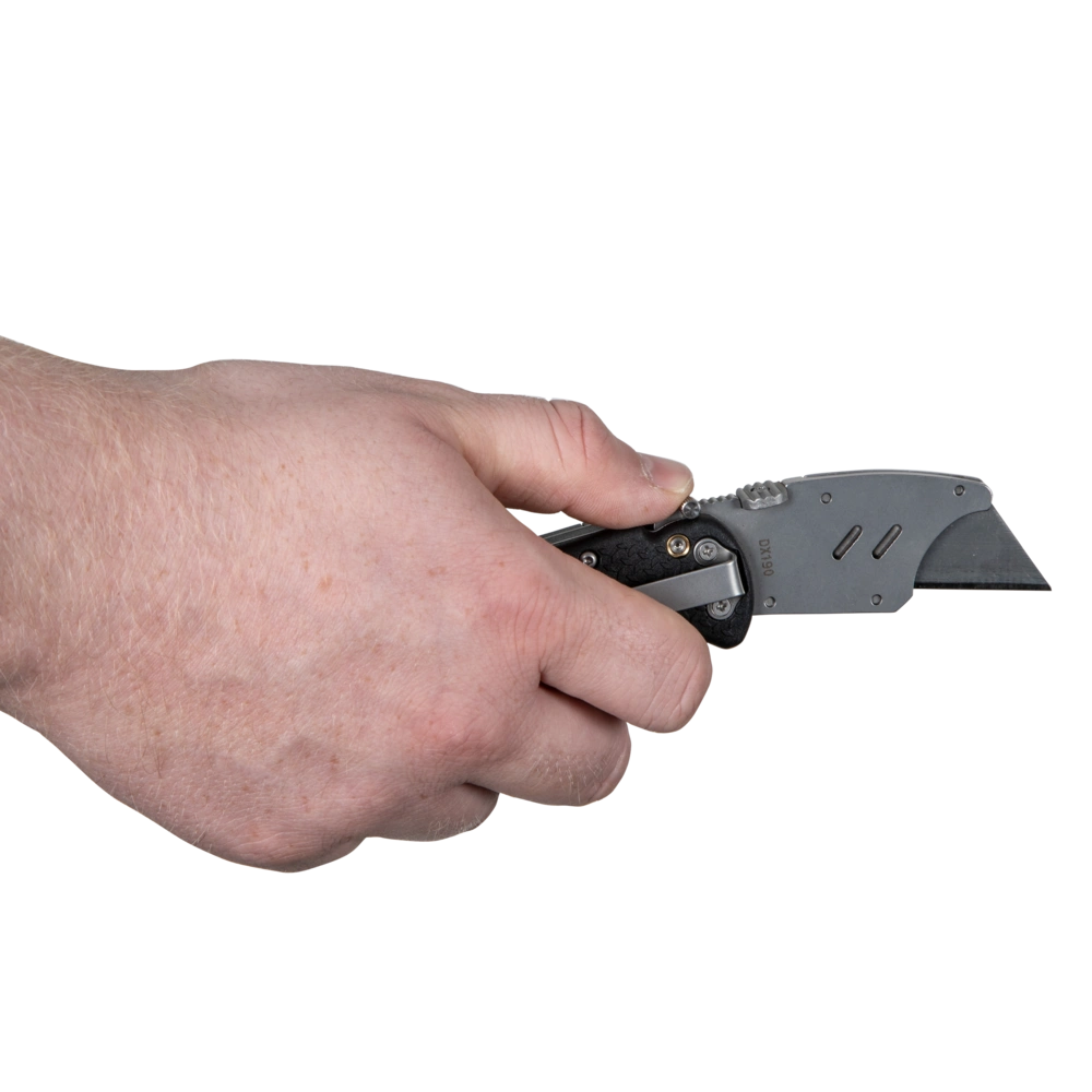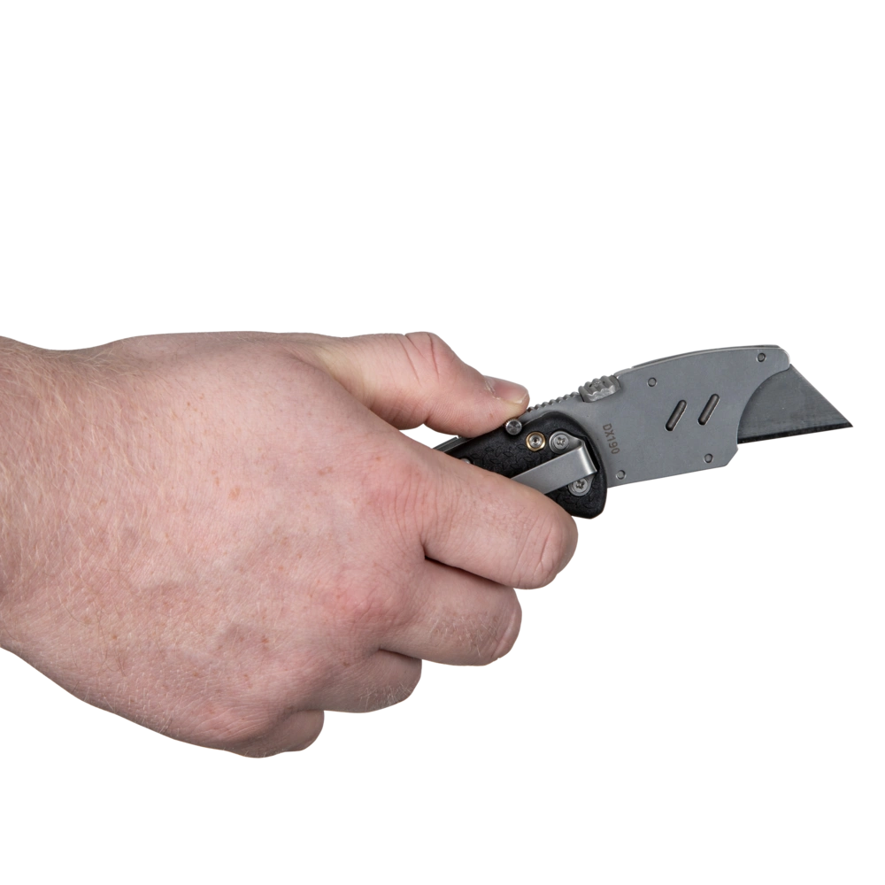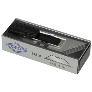Professional cutter knife with folding function. It becomes a pocket knife with exchangeable trapezoidal blades. Double locking prevents accidental closing. A clearance-free blade holder made of stainless steel provides for precise cuts. Three spare blades are available inside the handle compartment. The blades can be exchanged very quickly. Ergonomically shaped, with non-slip grip shells, the knife fits in your hand nicely. A metal retaining clip for pockets is part of the equipment.
