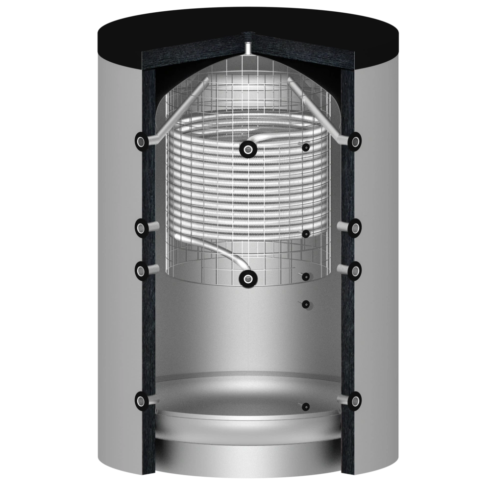 The structure of fresh water storage tanks differs fundamentally from conventional, large-volume domestic hot water storage tanks. A built-in corrugated stainless steel pipe separates the drinking water from the heating water and also serves as a high-performance heat exchanger. This combines the advantages of a buffer storage tank with those of an instantaneous water heater.