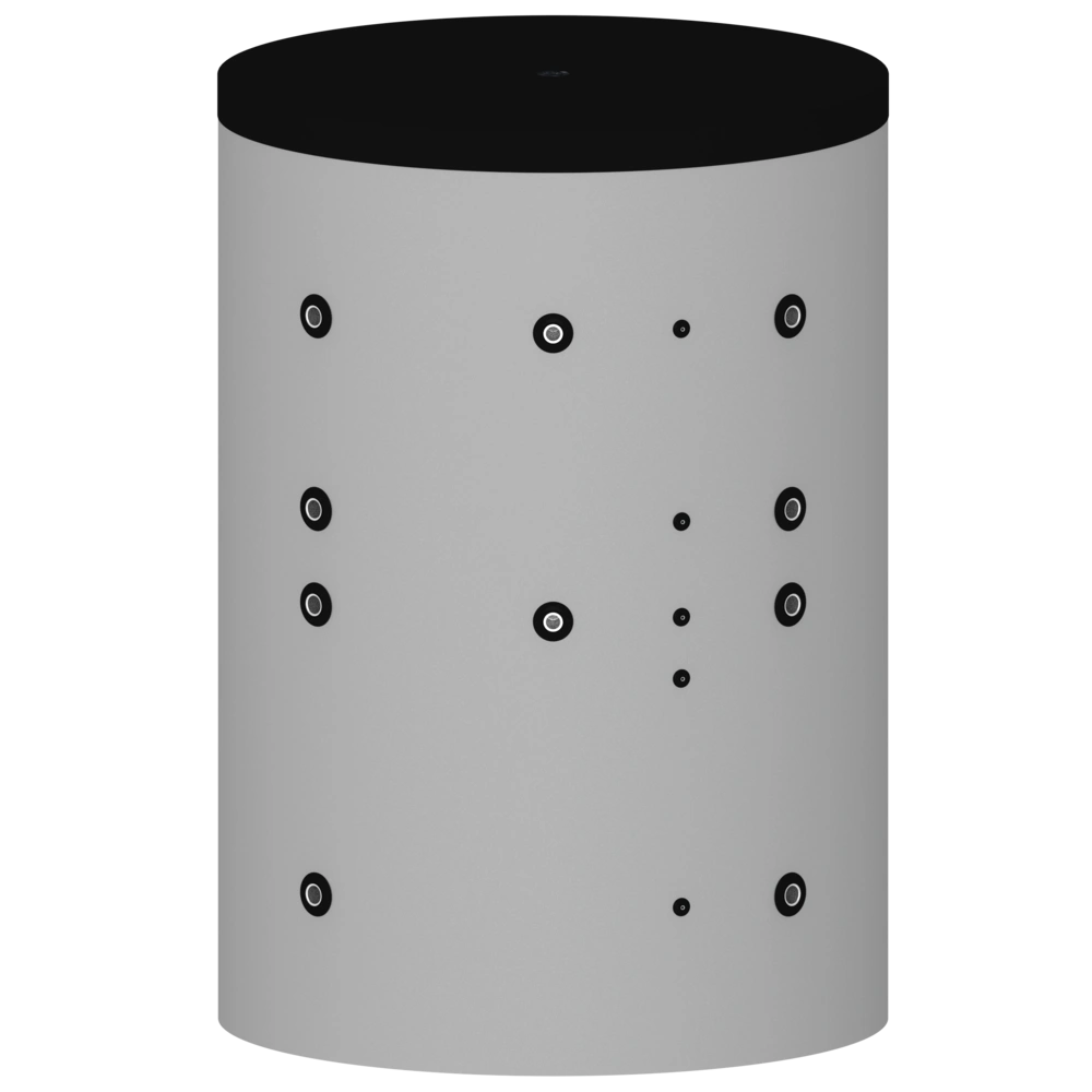 Naast de bufferaansluitingen A en N voor aanvoer en retour, blijven er 5 aansluitingen over voor andere doeleinden. De productafbeelding toont een 3D-weergave van de opslagtank. Stel het filter in op ALLES om de exacte lay-out van de aansluitingen te zien.