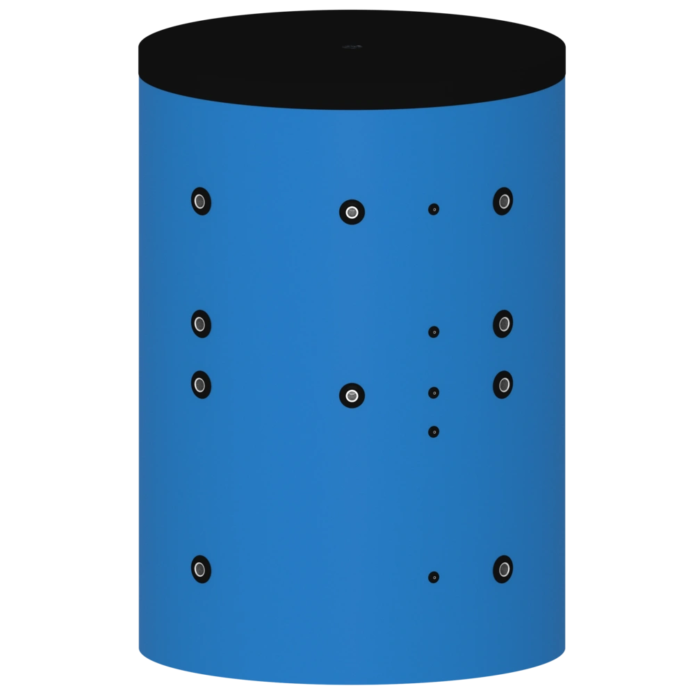 Naast de bufferaansluitingen A en N voor aanvoer en retour, blijven er 5 aansluitingen over voor andere doeleinden. De productafbeelding toont een 3D-weergave van de opslagtank. Stel het filter in op ALLES om de exacte lay-out van de aansluitingen te zien.