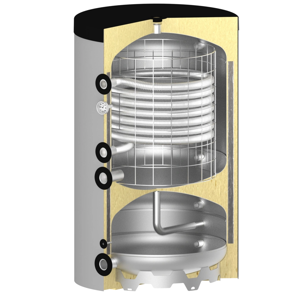 Deze combinatieboiler werkt bovenaan als verswaterboiler. Het warme water stroomt door de RVS-ribbelbuis. Omgekeerd principe bij boiler -660. Deze is geëmailleerd, het verwarmingswater stroomt door de gladde buiswarmtewisselaar en verwarmt het stilstaande tapwater in de boiler. De onderste boilers verschillen in die zin dat deze boiler als complete buffertank fungeert. Door de boiler -660 loopt alleen de retourleiding om volume te creëren voor een ontdooiproces van de warmtepomp.