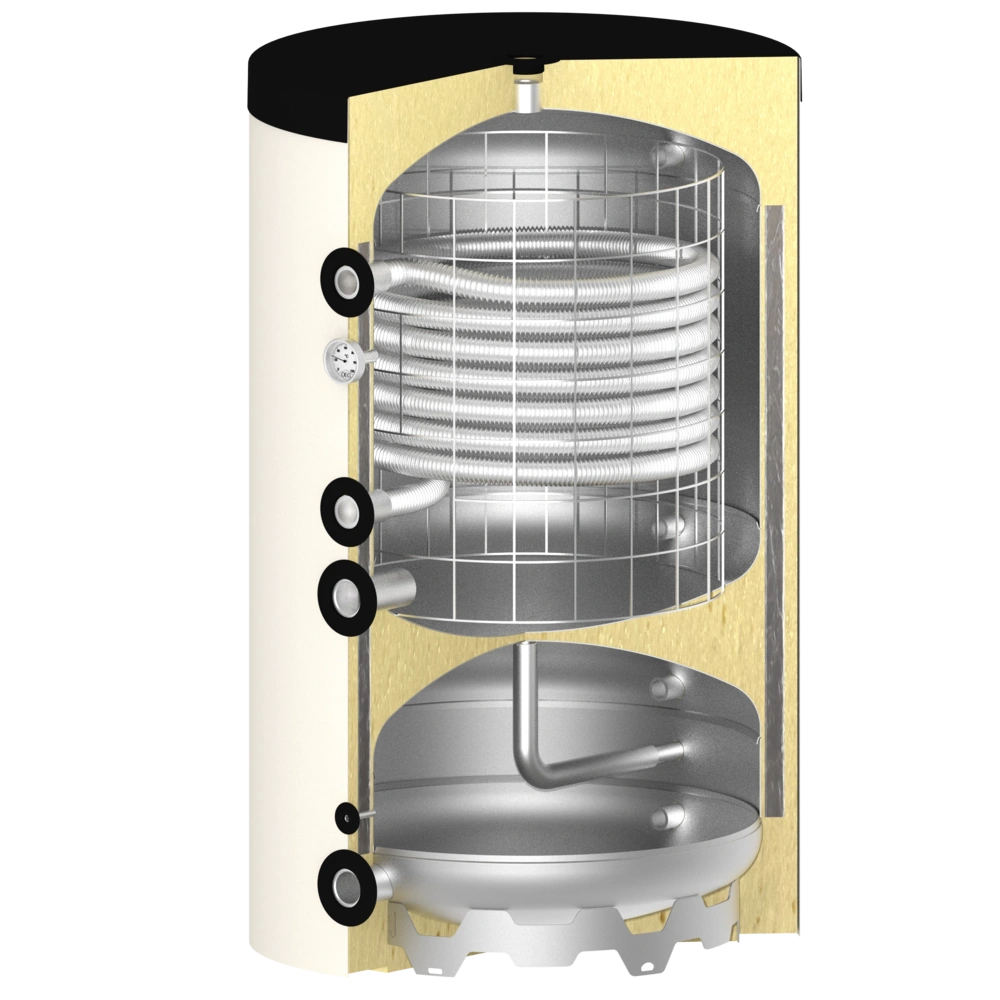 Deze combinatieboiler werkt bovenaan als verswaterboiler. Het warme water stroomt door de RVS-ribbelbuis. Omgekeerd principe bij boiler -660. Deze is geëmailleerd, het verwarmingswater stroomt door de gladde buiswarmtewisselaar en verwarmt het stilstaande tapwater in de boiler. De onderste boilers verschillen in die zin dat deze boiler als complete buffertank fungeert. Door de boiler -660 loopt alleen de retourleiding om volume te creëren voor een ontdooiproces van de warmtepomp.