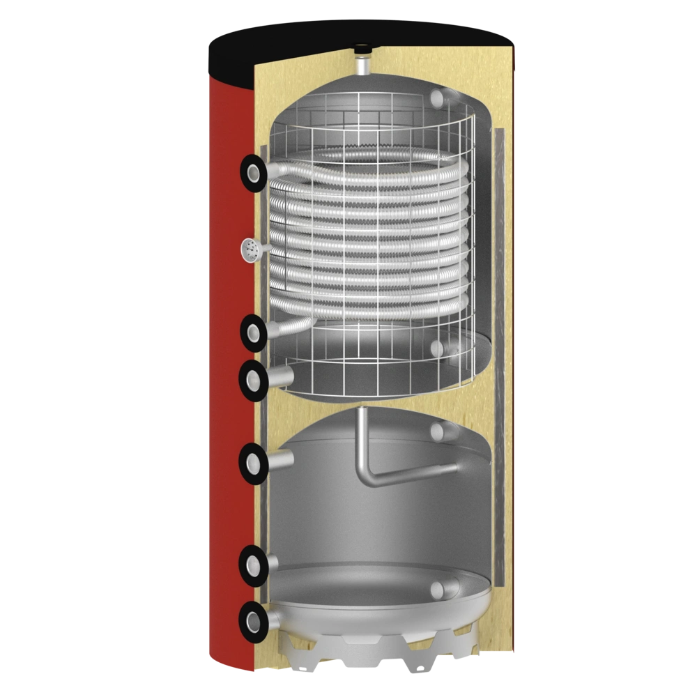 All product informationInnovative fresh-water storage tank with separate buffer unit for heating water. Ideal for low system temperatures and efficient use of heat pumps with high output capacities in domestic hot water production at the same. The lower buffer storage tank section provides sufficient capacity for the use as heating water reservoir. The clear separation of the two tank sections allows for large temperature differences. That is why it is possible to use the buffer section for cooling in combination with a heat pump. The integrated stainless steel heat exchanger provides hygienically clean drinking water at any time and does not need an anode. The high-quality vacuum insulation guarantees low heat losses. For both storage tank sections, there is the option to install a heating element.
