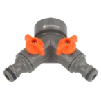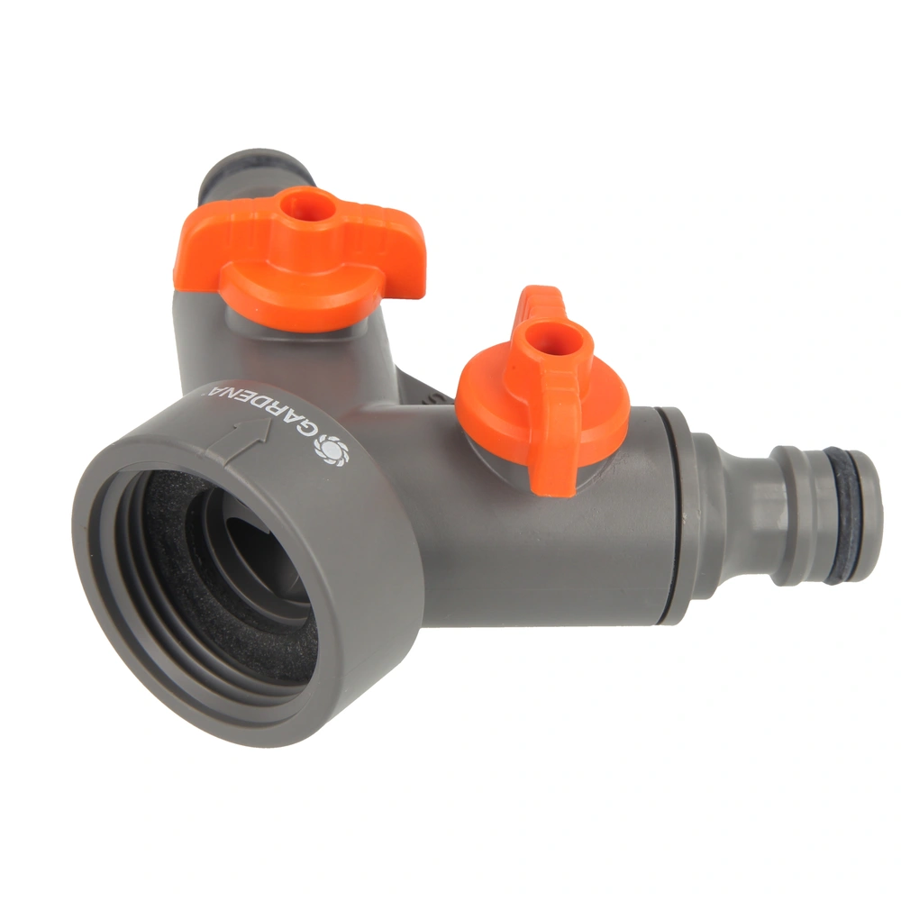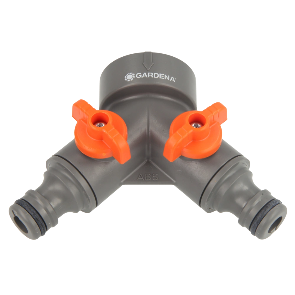 All product informationTwin tap connector with 2 plug connections for the Gardena hose connector and connection for a water tap with 1” male thread for operating two watering accessories at the same time. The water flow can be continuously regulated at both outlets, independently from each other.
