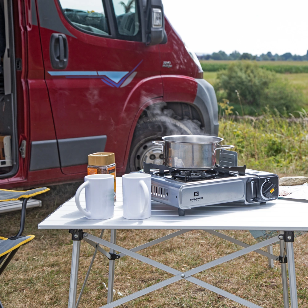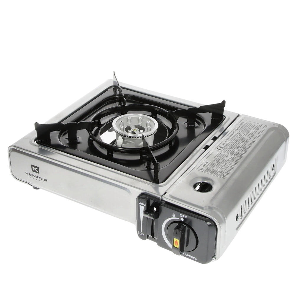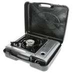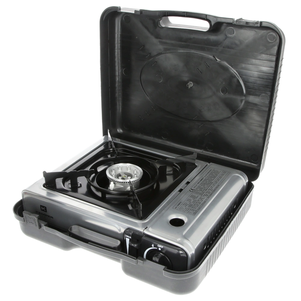 All product information Scope of deliveryPowerful outdoor stove made of powder-coated steel sheet with piezo ignition for gas pressure cartridges. The stove is suitable for pots and pans up to a diameter of up to 18 cm and supplied in a practical suitcase for easy transport.