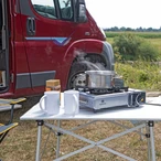 Powerful outdoor stove made of powder-coated steel sheet with piezo ignition for gas pressure cartridges. The stove is suitable for pots and pans up to a diameter of up to 18 cm and supplied in a practical suitcase for easy transport.