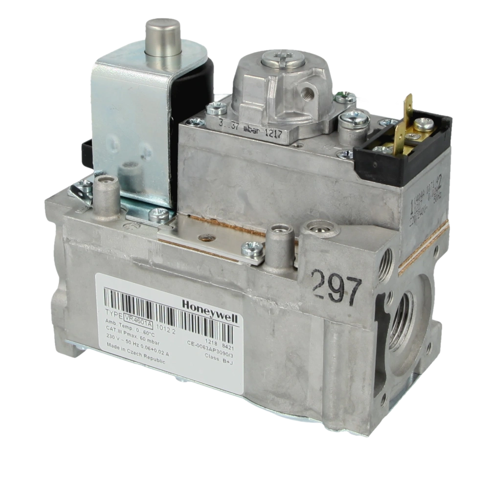 Combination gas valves for automatic ignition systems have two electric valves in line. Gas control blocks are suitable for the regulation and supervision of the pilot and/or main flame of atmospheric gas burners in heating devices.
