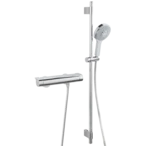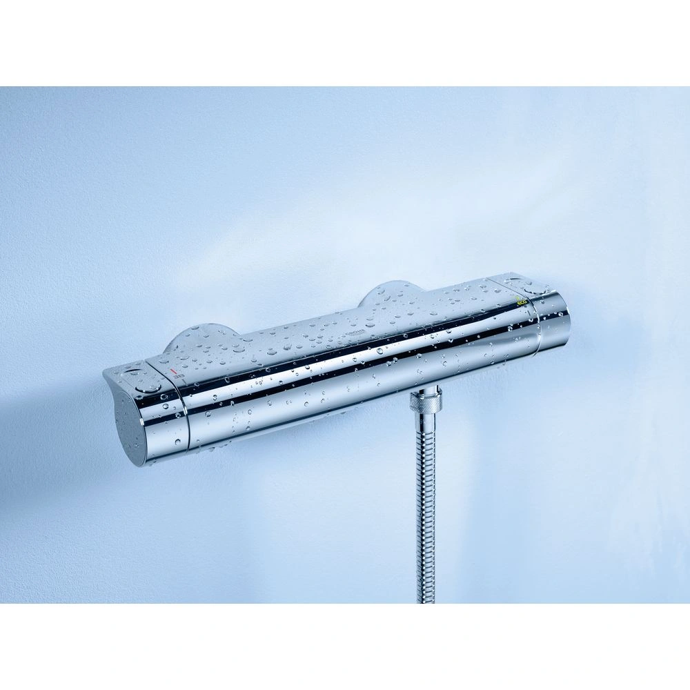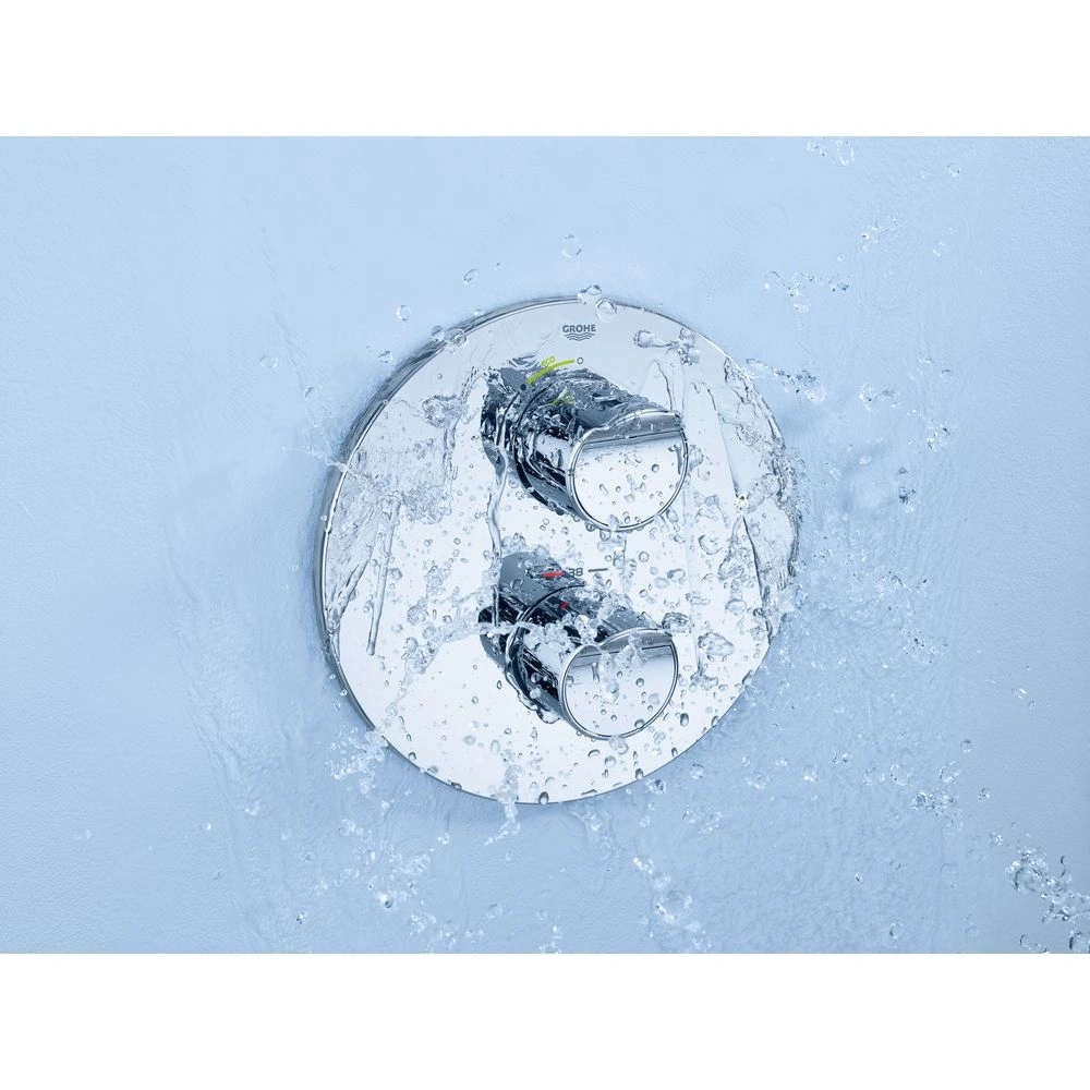 DN 15 is equipped with a GROHE CoolTouch® safety housing, GROHE StarLight® chrome finish, a GROHE TurboStat® compact cartridge with wax-thermoelement, GROHE EcoJoy® technology for less water and perfect flow and integrated mixed water shut-off.