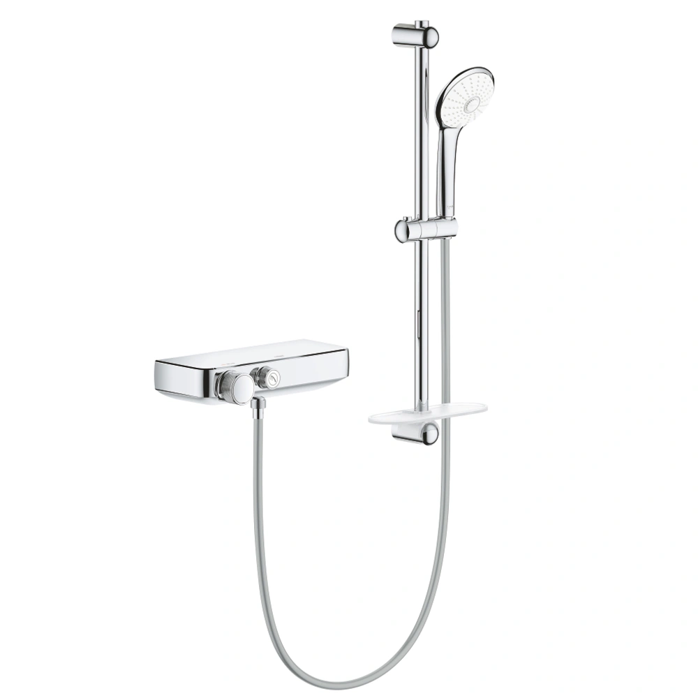 The Grotherm Smartcontrol thermostatic shower mixer with shower set can be started and stopped via push-turn control. By turning the buttons, the temperature and the flow rate can be individually adjusted...