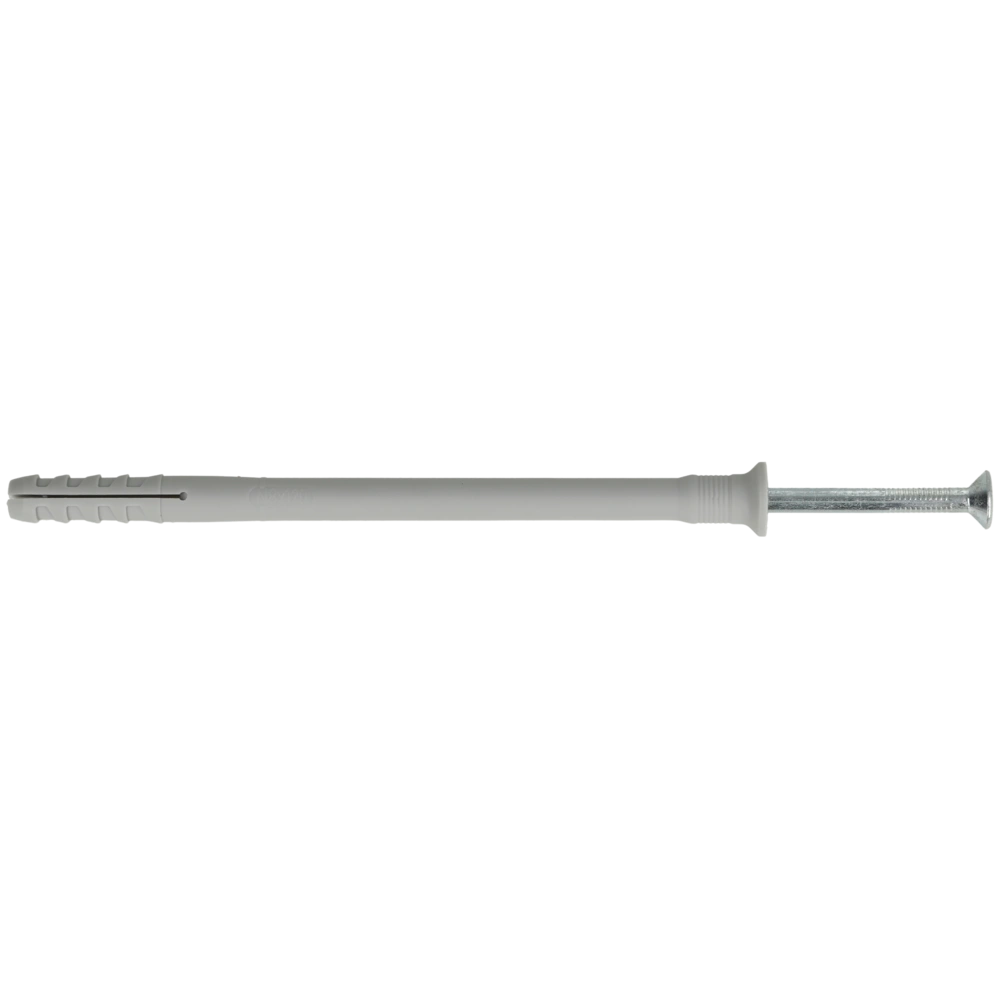 Hammer-in plug for push-through installation in almost all materials. The hammer-in plug consists of a high-quality nylon plug and a zinc-plated nail screw. The rapid hammerset installation reduces the amount of time required and the integrated hammer-in stop prevents the plug from expanding prematurely. The enclosed countersunk head screw can be easily unscrewed by a Phillips screwdriver, thus allowing for subsequent dismantling.