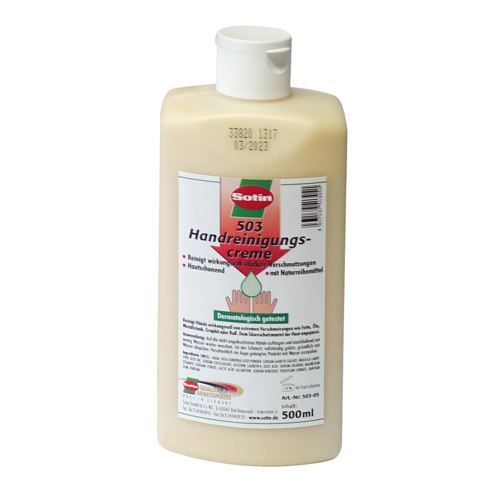 The cream with skin-friendly rubbing agents shows an excellent dissolving power for grease, oil, soot, paint and metal pastes. It is slightly scented.