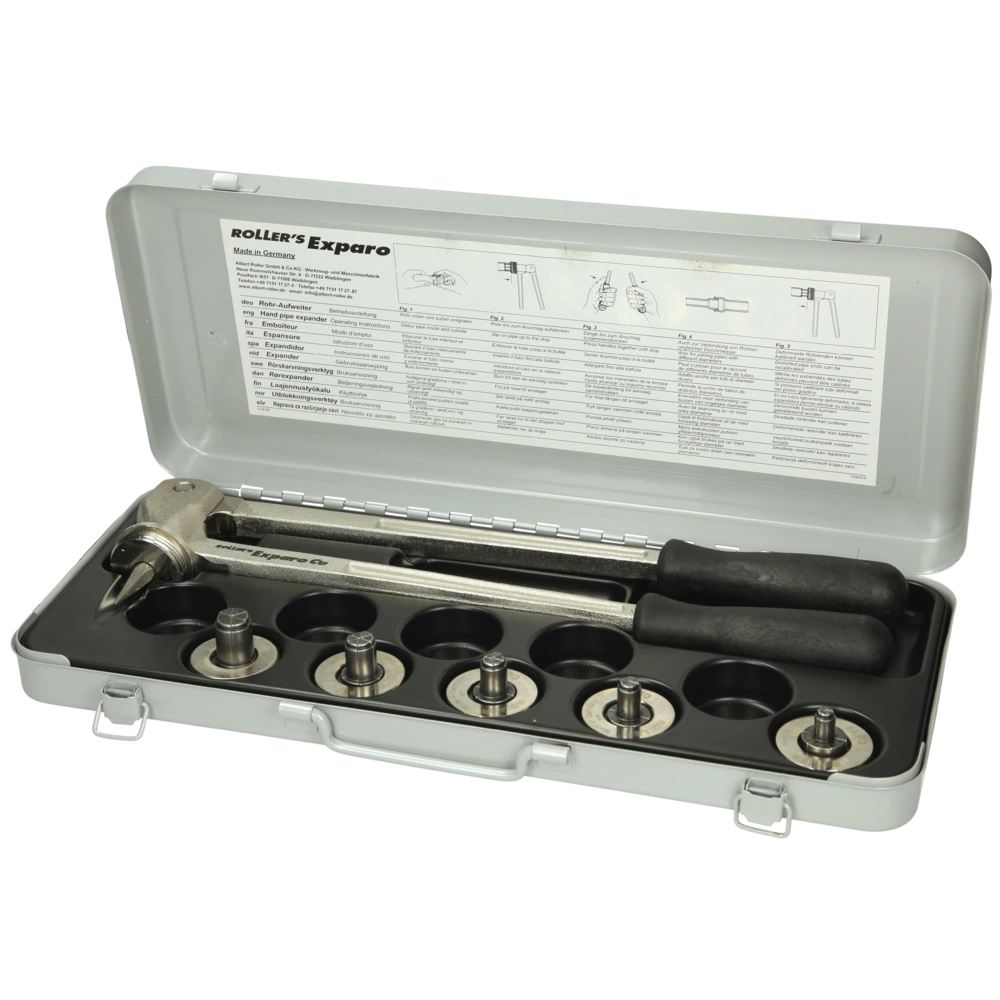 Robust manual expander for tubes made of copper, aluminium and steel. The set has a torsion-free, force-transmitting expander and a hexagonal mandrel ensuring even centric expansion. The attachments can be replaced easily and ensure perfect DVGW-compliant pipe connections.